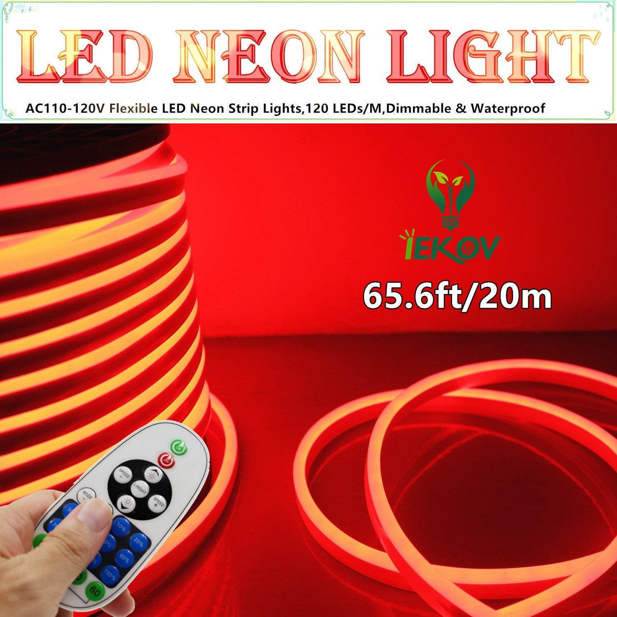 IEKOV LED Neon Light, Dimmable Waterproof Rope Light, 20m/65.6ft, Red, Flexible 2835 SMD, Model NEON LIGHT-R-20M
