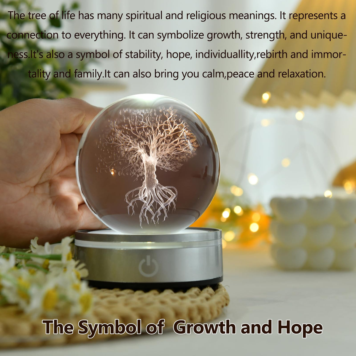 Q: How does the lighting work on the Tree of Life Crystal Ball?A: The crystal ball features a colorful lighting base that enhances its 3D Tree of Life engraving, creating a captivating atmosphere both during the day and at night.