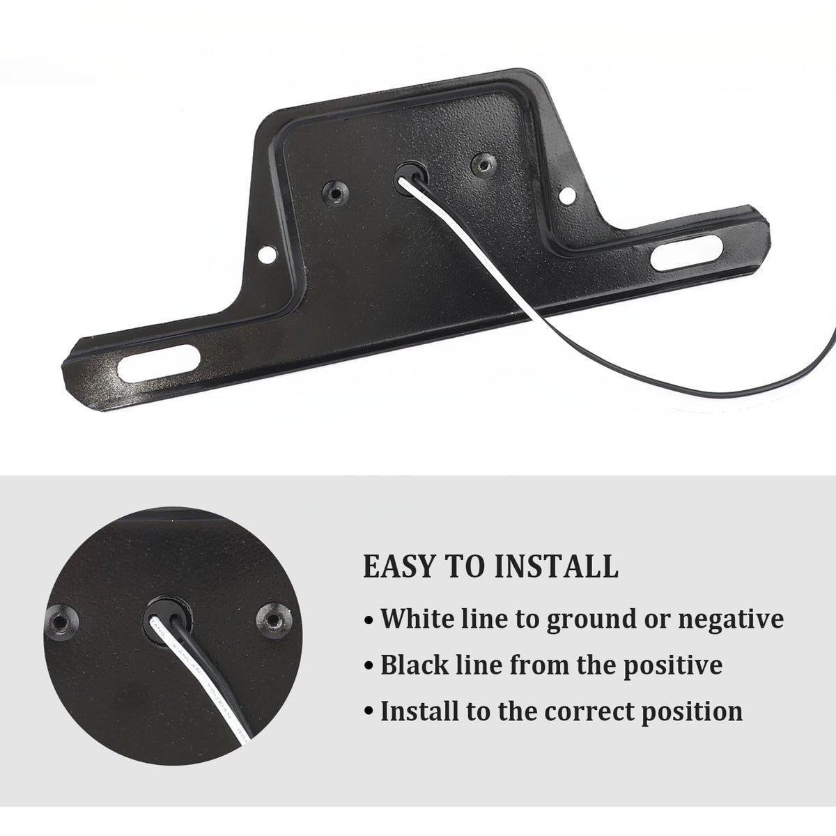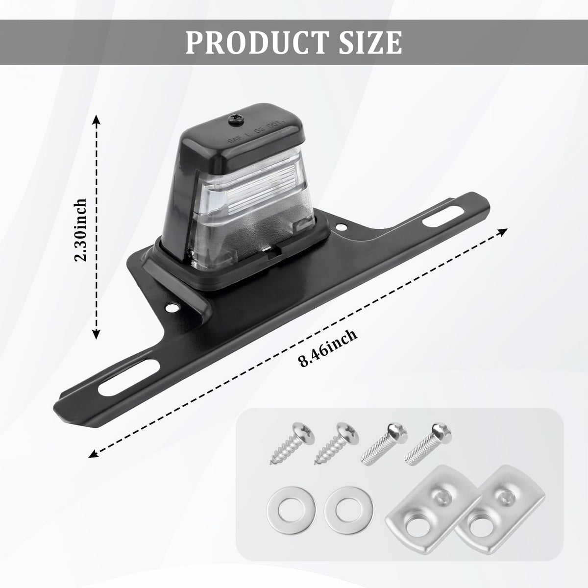 LICENSE PLATE LIGHT MAKES YOUR CAR UNIQUE AND MAKES THE LICENSE PLATE BRIGHTER AND MORE BEAUTIFUL!?? [Product Attributes]? Colors: Black? Sizes: 8.46x2.96x2.30 inch? Weight: 6.15 oz? Material: ABS+Metal? Packaging: 1* License Plate Light 2* Bolts2* Screws2* Washers2* Gaskets?? [Product Functions]? Feature: High brightness, sturdy, not easy to aging? Function: For illuminating license plates