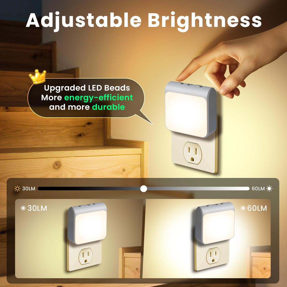 Q: How bright are these night lights compared to standard options?A: These night lights shine at sixty lumens, which is fifty percent brighter than standard forty-lumen night lights, providing enhanced visibility for navigating spaces at night.