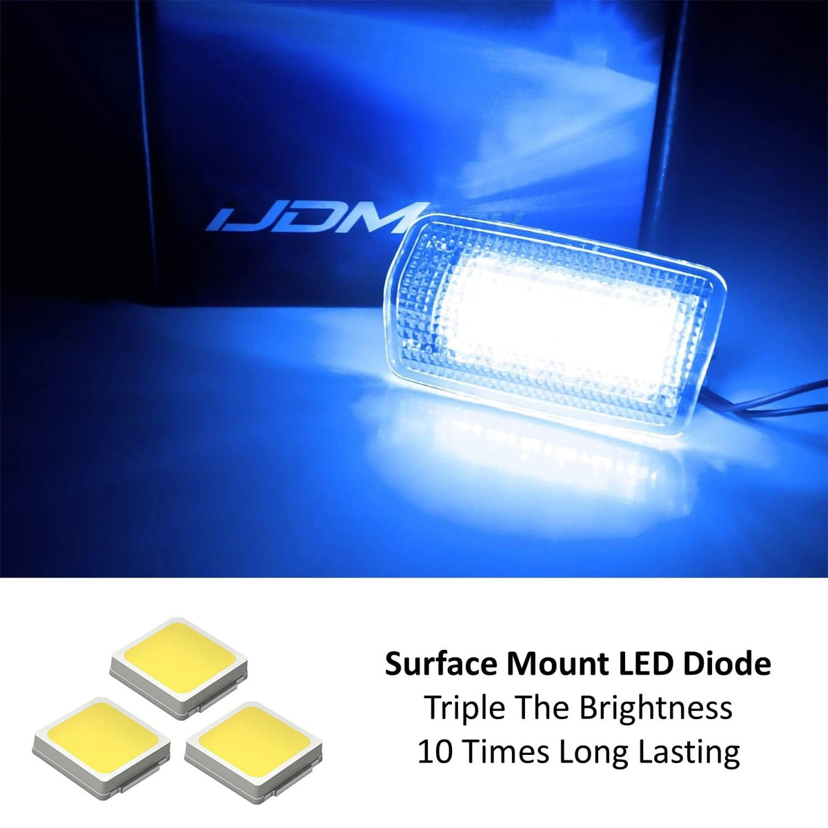 Q: What is the brightness level of the iJDMTOY LED courtesy light?A: The LED courtesy light features ultra blue LED diodes that provide triple the brightness compared to standard yellowish incandescent bulbs, ensuring significantly improved illumination.