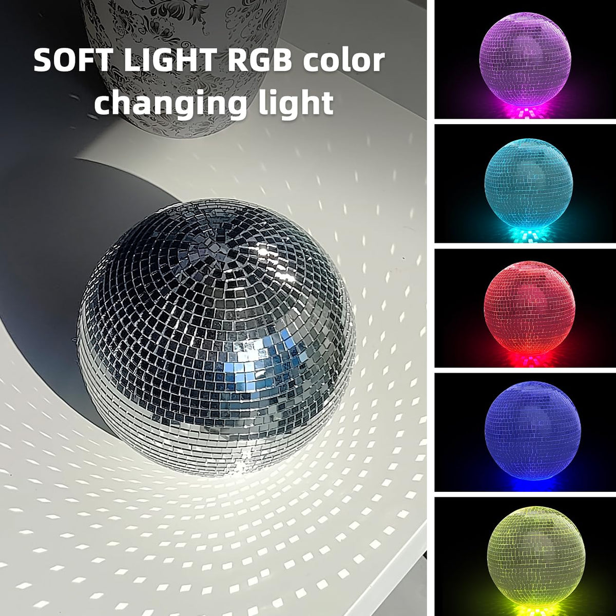 Q: What type of lighting does the Silver Disco Ball provide?A: The Silver Disco Ball features soft RGB lighting that can be adjusted to create different color effects, perfect for setting a mood for parties or as a nightlight.