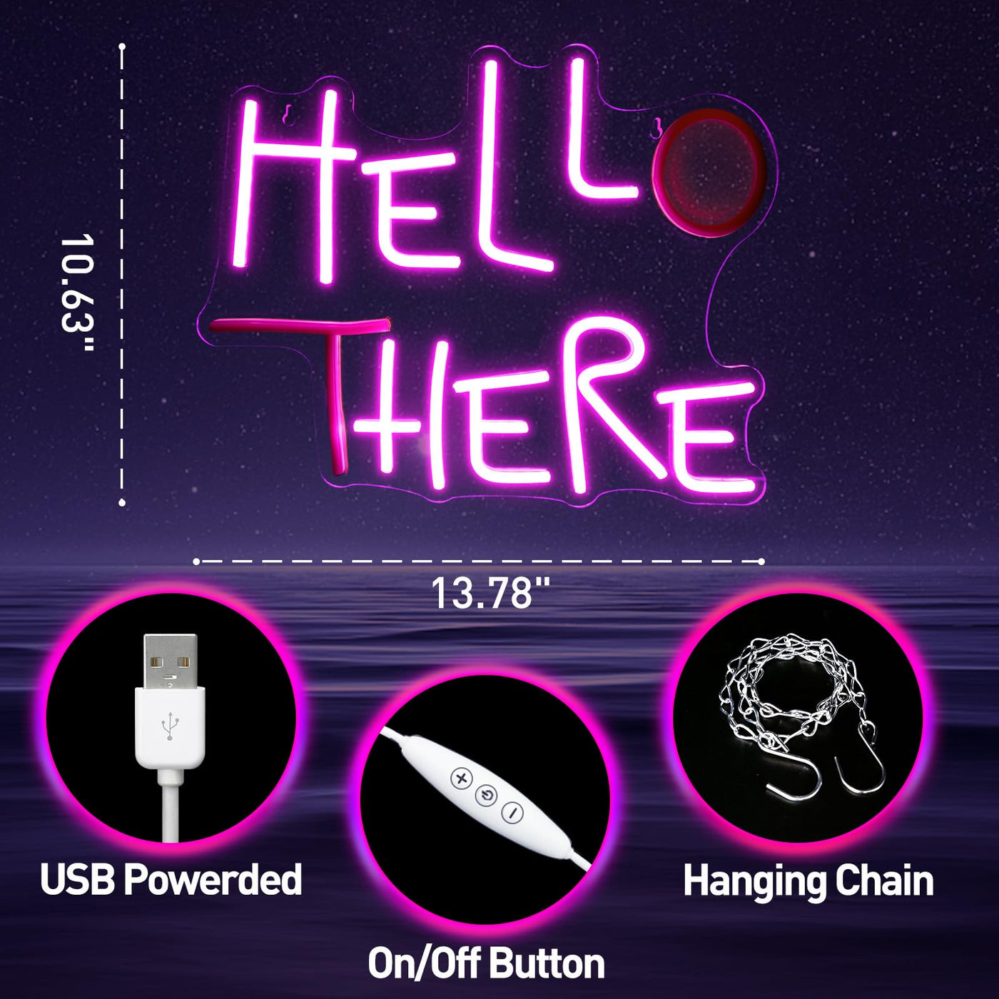 The Hello There Neon Sign measures 13.78" × 10.63” and comes in a striking Hell Here-Pink color, ensuring it stands out in any setting. Elevate your space with this stylish, functional, and fun lighting solution.