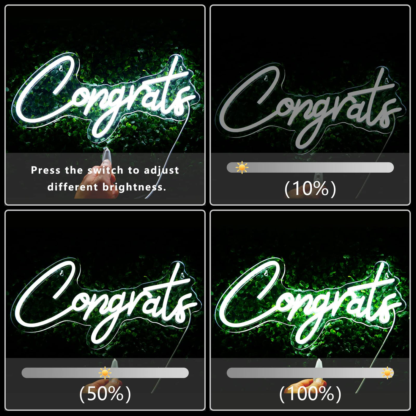 Q: Is the neon sign dimmable?A: Yes, the IMEGINA Congrats Neon Sign features a dimmer that allows you to adjust the brightness to three different levels, giving you control over the ambiance.
