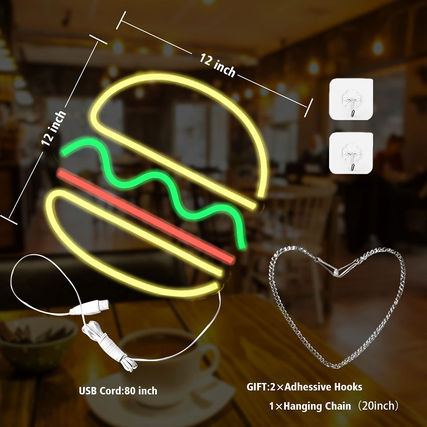 ?? Improve Your Business: The 12*12 inch hamburger neon sign is a bright yet non-glaring light, perfect for indoor decoration in food shops, cafes, bars, and homes.