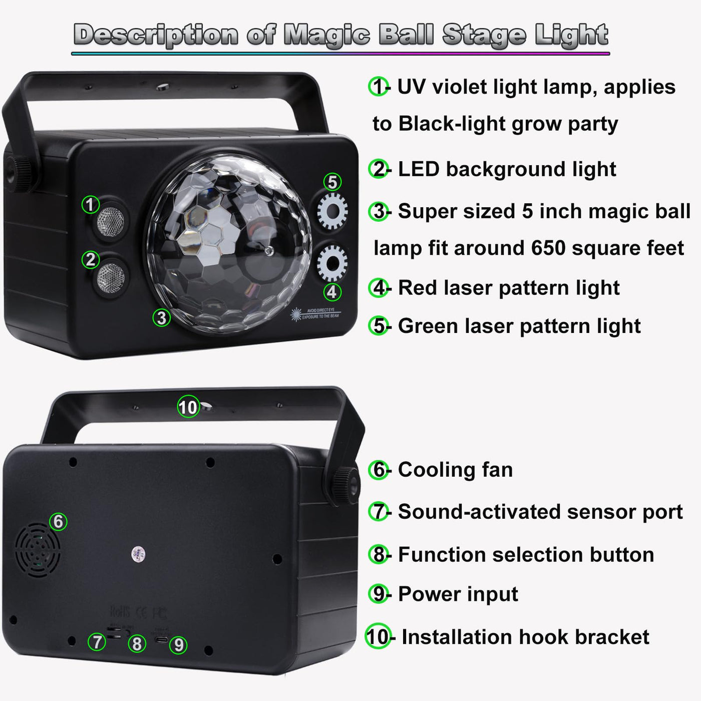 Q: What are the main features of the Disco Ball Light?A: The Disco Ball Light features six color lighting options, green and red laser patterns, three automatic modes, and three sound-activated modes. It also includes a remote control for easy operation.
