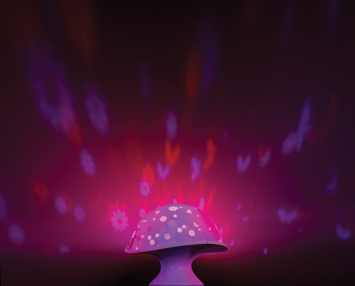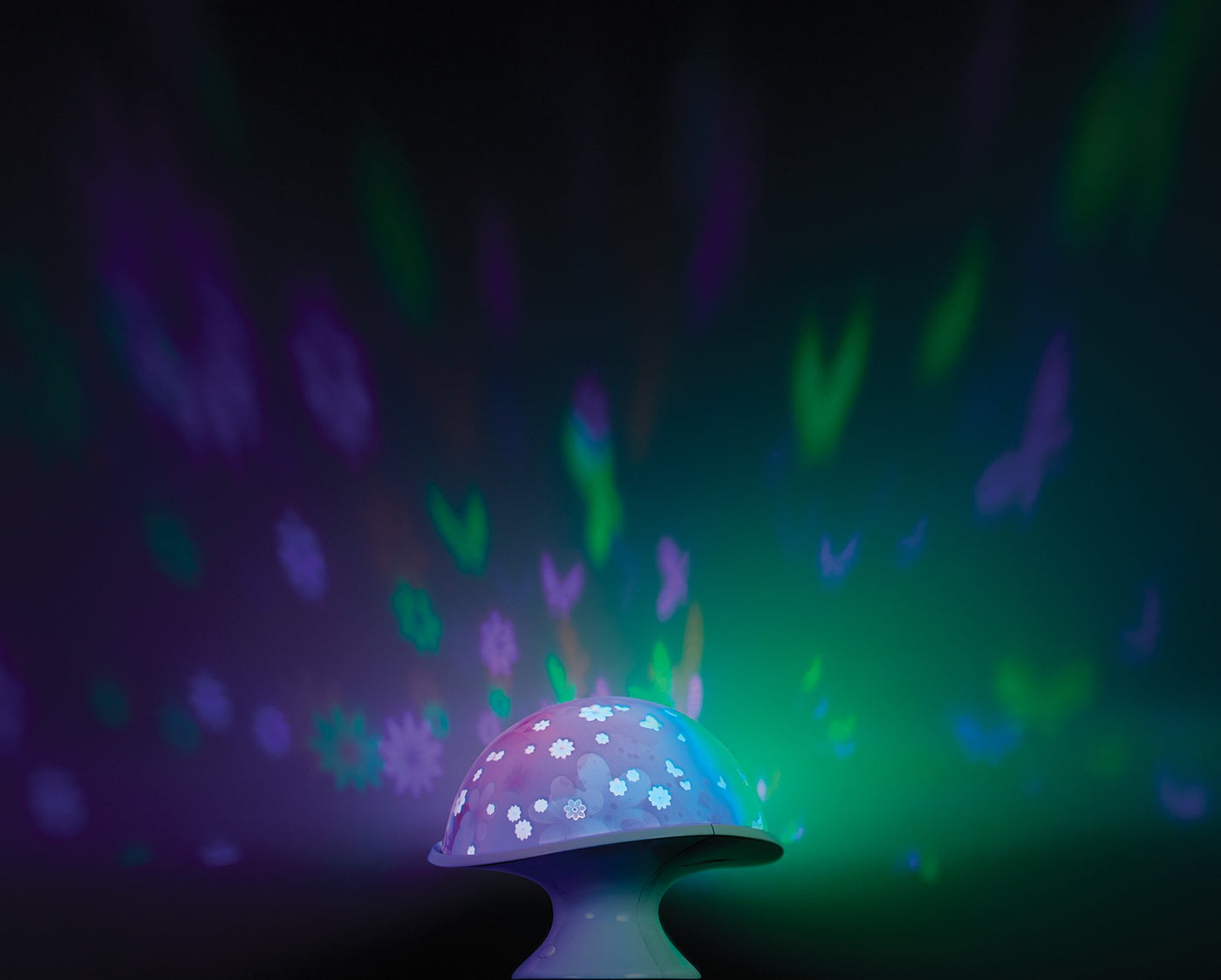 Create a magical light show in your room! See beautiful, multicolored lights inside the mushroom and project butterflies and flowers on your wall. With 8 different light show programs to match your mood and style. Features auto shut-off for bedtime.