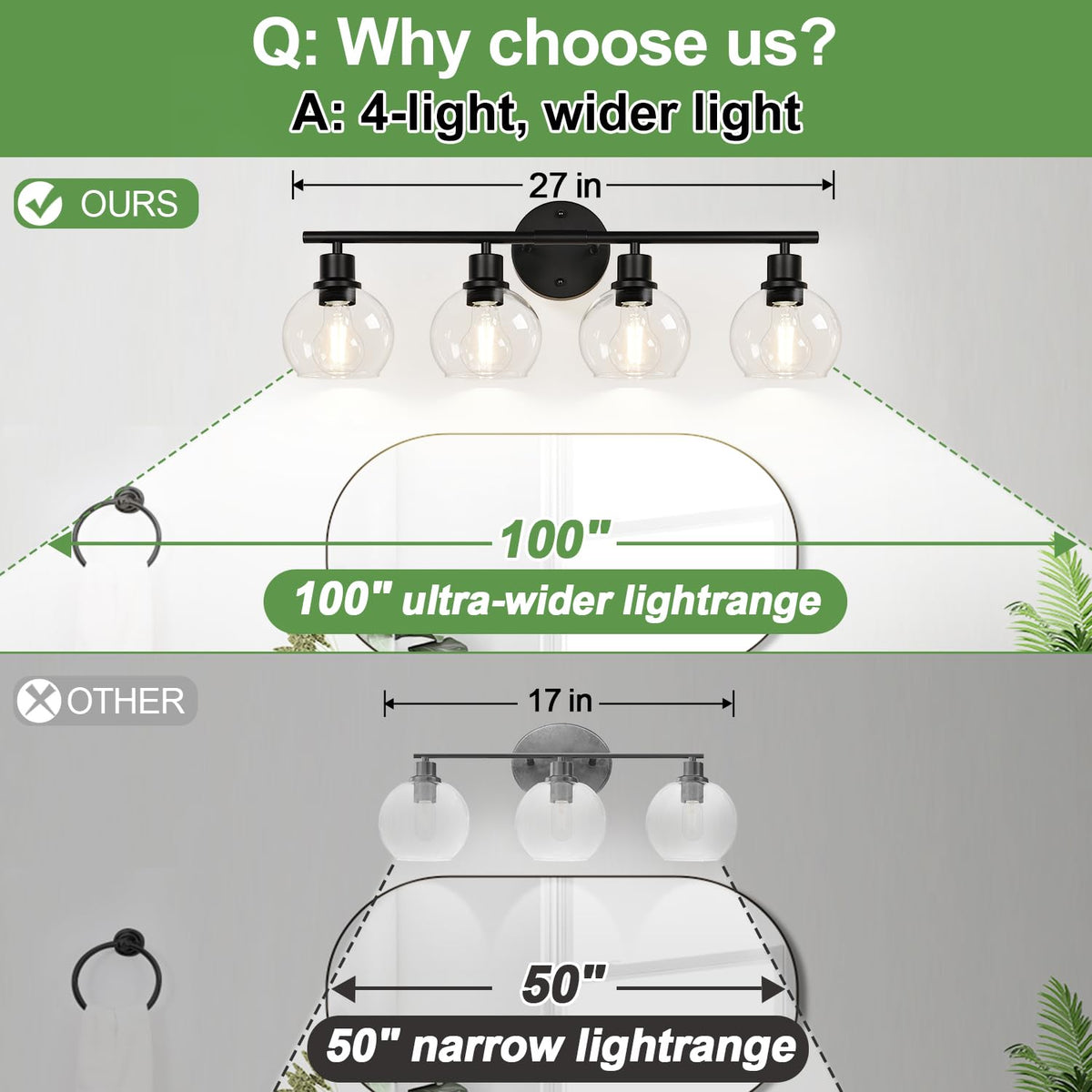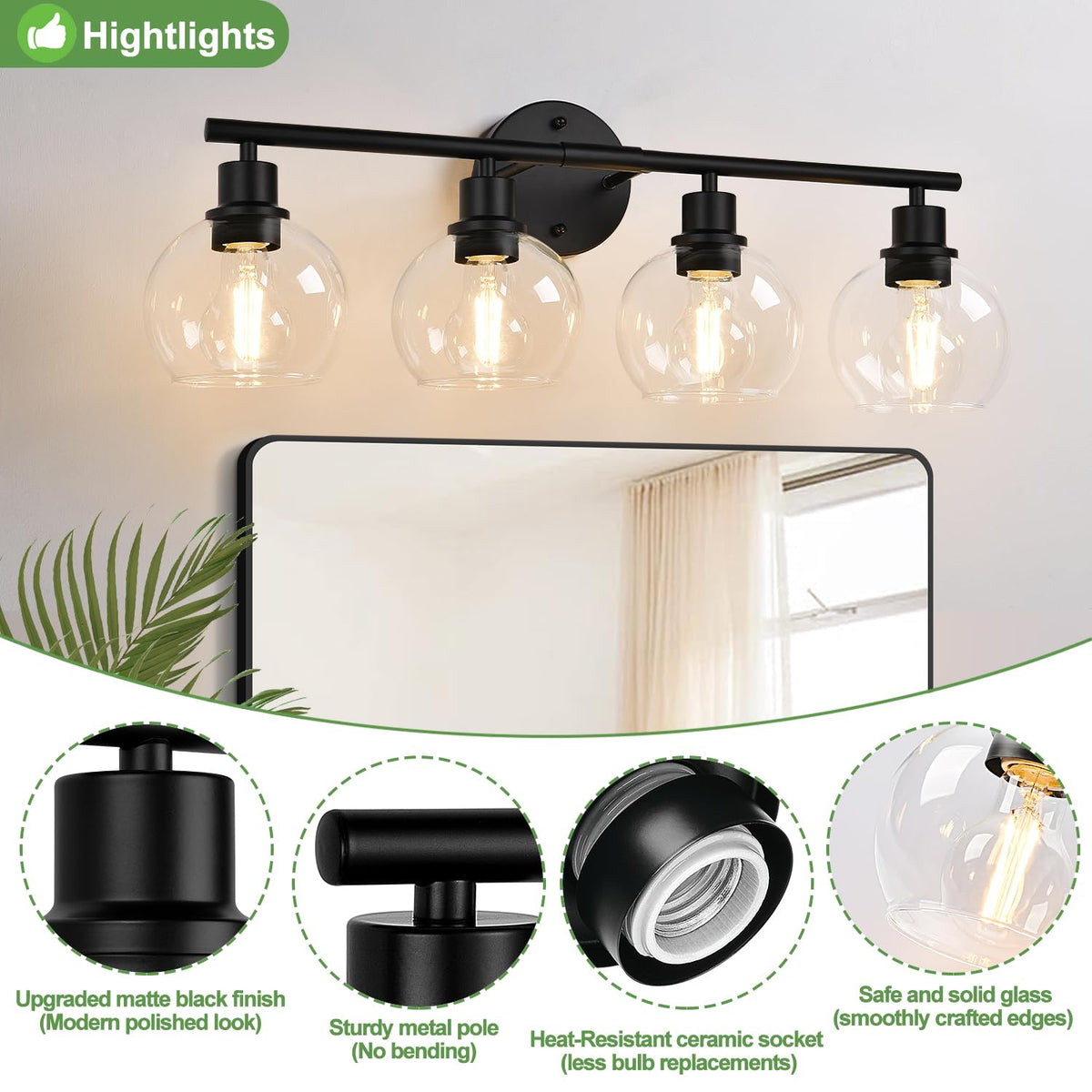Indoi 2025 Upgrade 4-Light Bathroom Light Fixtures, Black Bathroom Lights Over Mirror With Clear Glass Globe Shade, Vanity Light