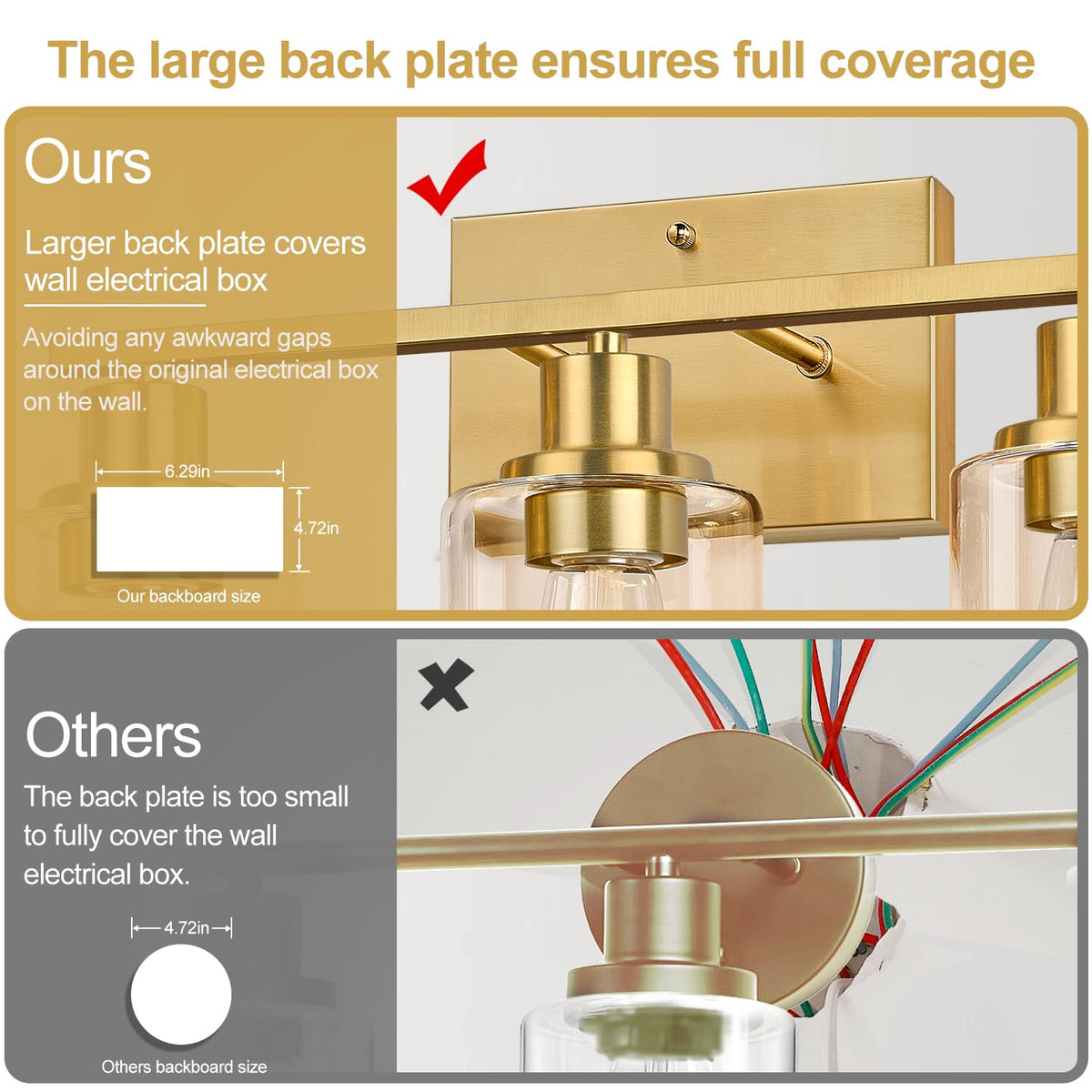 Q: What is the design style of the 3-Light Vanity Lights?A: The 3-Light Vanity Lights feature an elegant brushed gold design that complements modern, farmhouse, and traditional decor, making it a versatile addition to various home styles.