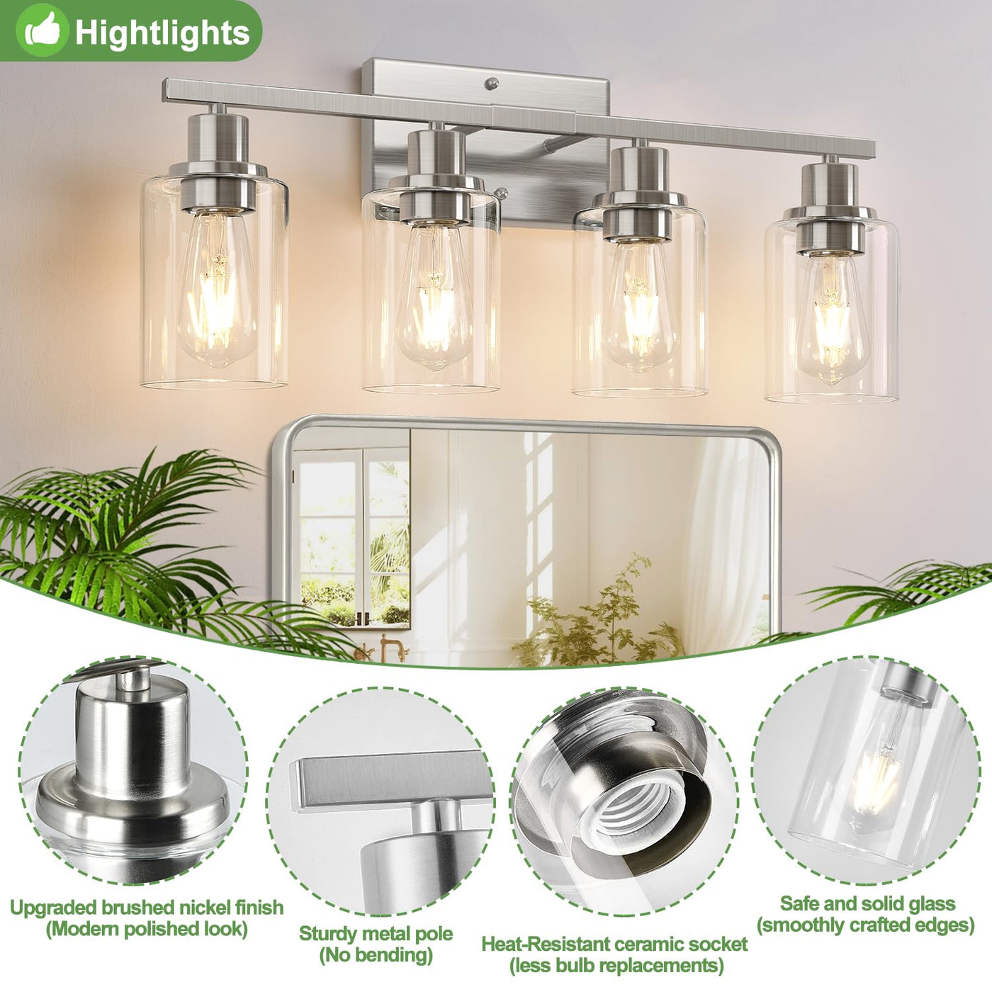 Indoi 4-Light Bathroom Light Fixtures, Brushed Nickel Vanity Lights With Clear Glass Shades, Modern Bathroom Wall Lamp For Mirro