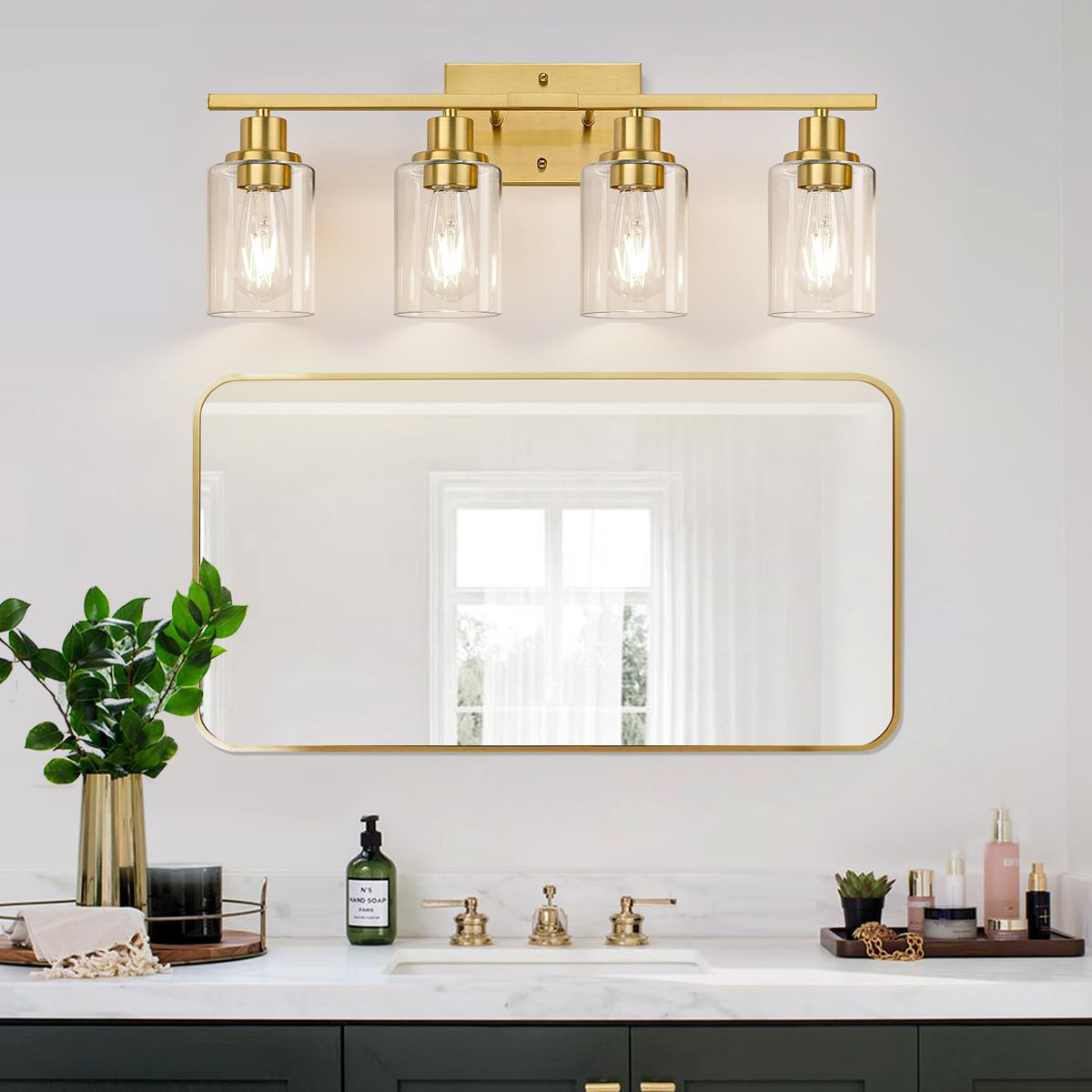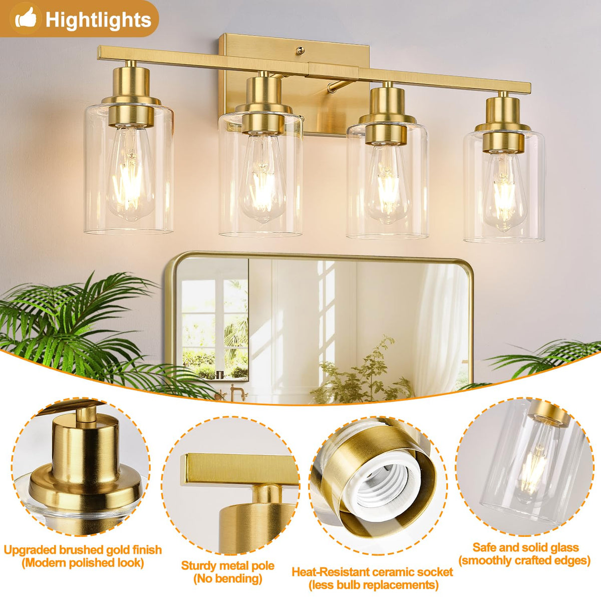 Indoi 4-Light Vanity Lights With Clear Glass Shades, Brushed Gold Bathroom Light Fixtures Over Mirror, Modern Bathroom Wall Lamp