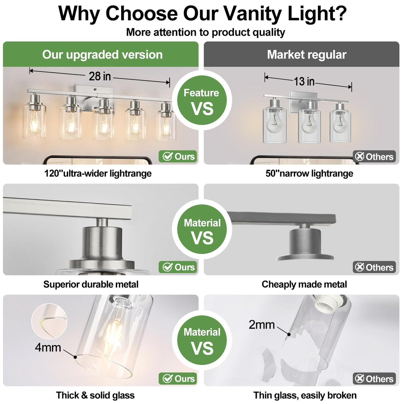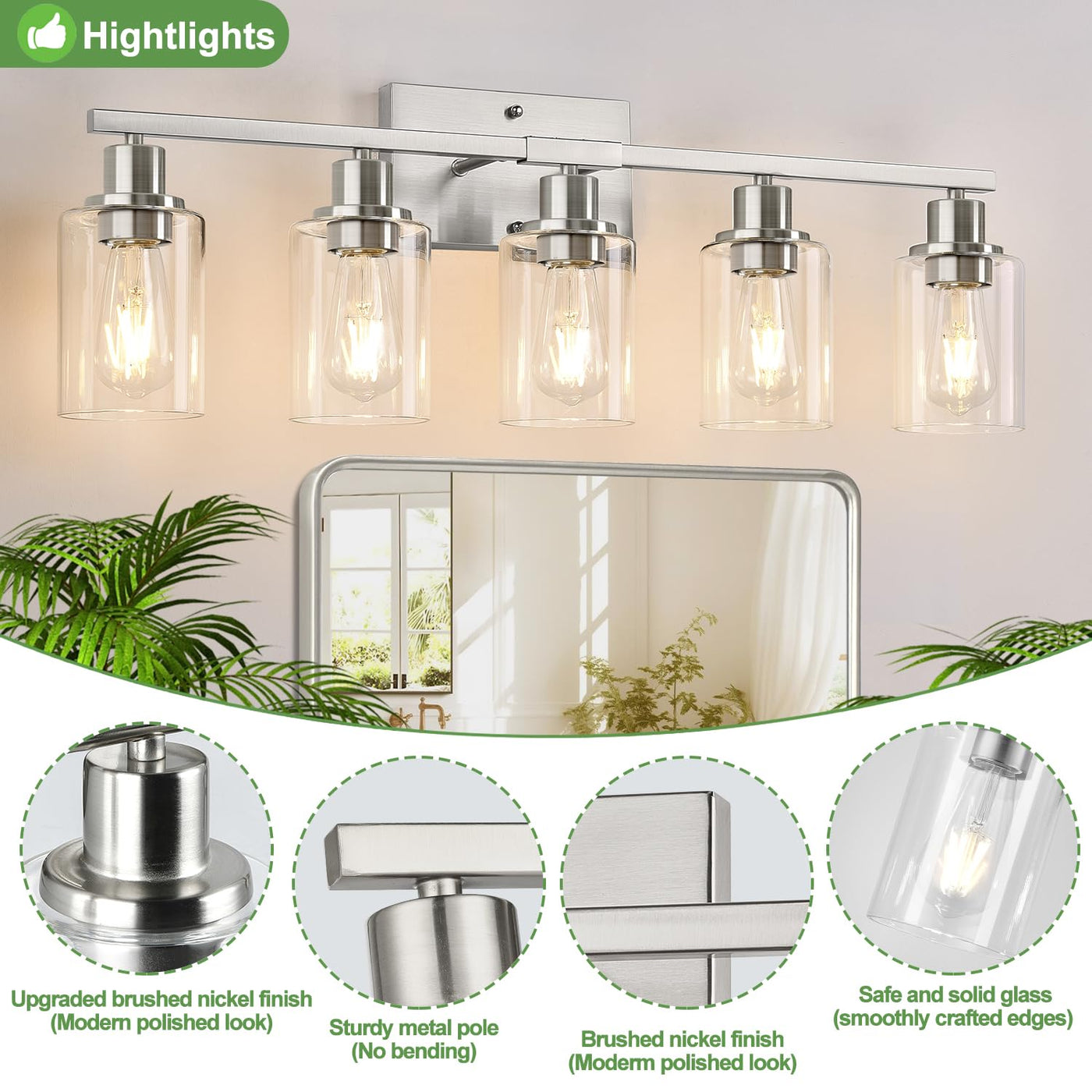 Indoi 5-Light Bathroom Vanity Light, Brushed Nickel with Clear Glass Shades, Model LTW070