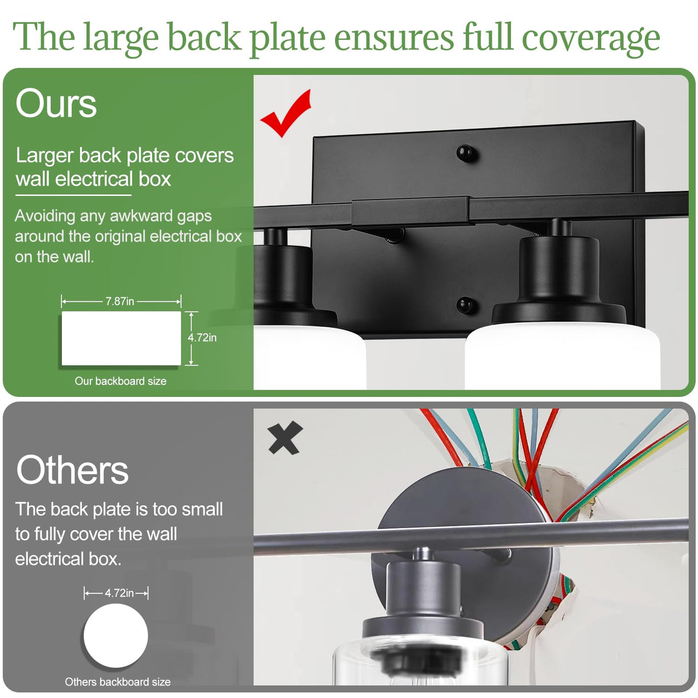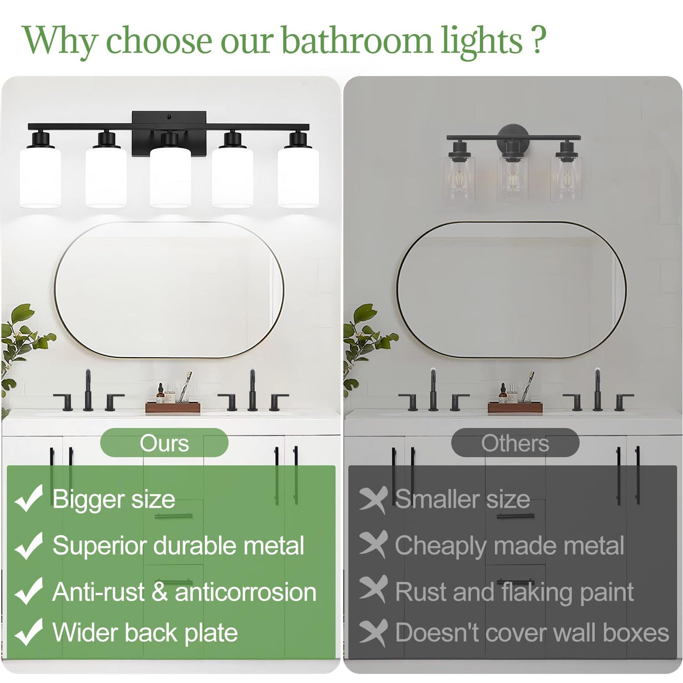 Q: What materials are used in the construction of the fixture?A: This bathroom light fixture is crafted with a durable metal frame and features milky white frosted glass shades, ensuring both style and longevity.