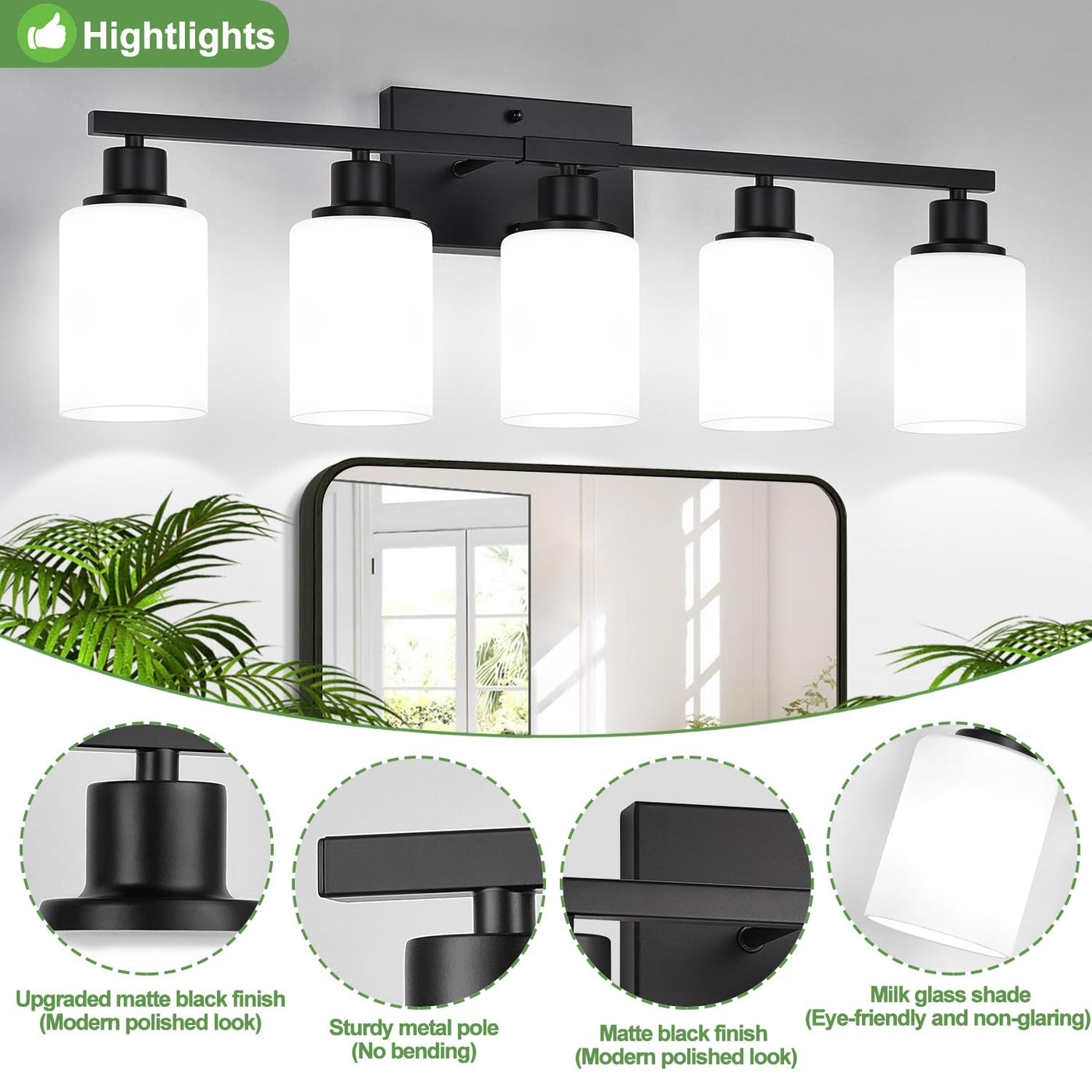 Indoi 5-Light Bathroom Vanity Light Fixture, Matte Black & Milky White Glass, Model LTW070, Up/Down Lighting for Mirror, Hallway