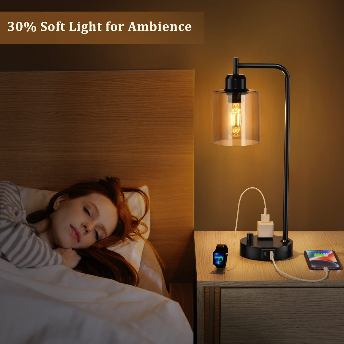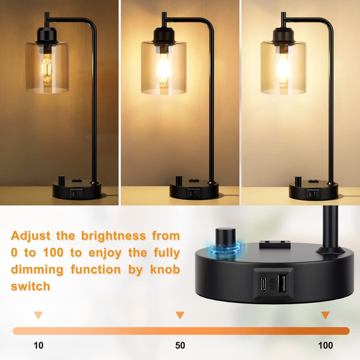 Industrial Bedside Desk Lamps For Bedroom - Grey Smoked Glass Shade Table Lamp With Usb C Port, Fully Dimmable Small Lamps With