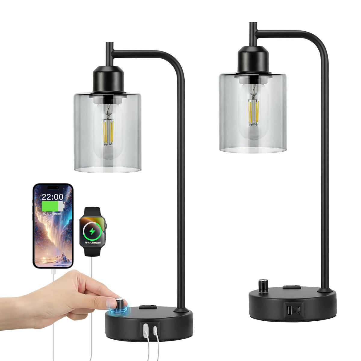 Industrial Desk Lamps For Office Set Of 2 - Fully Dimmable Bedside Lamps With Usb A C Ports And Outlet, Black Nightstand Lamps With Grey Glass Shade For Living Room, Table Lamps For Bedrooms Reading