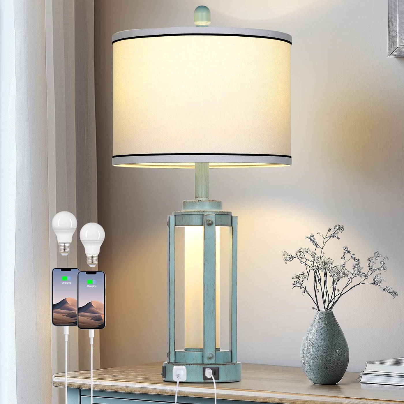 Industrial Farmhouse Table Lamp, 26'' Vintage Rustic Beside Lamp With Usb A+C Charging Ports & Ac Outlet, Nightstand Metal Lamp
