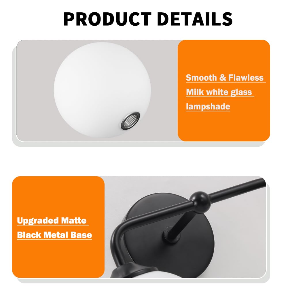 Industrial Matte Black 2-Lights Bathroom Light Fixtures Vanity Wall Sconce Lighting With Milky White Glass Shade Modern Bathroom Vanity Lighting Wall Sconces Over Mirror Dressing Table Bedroom