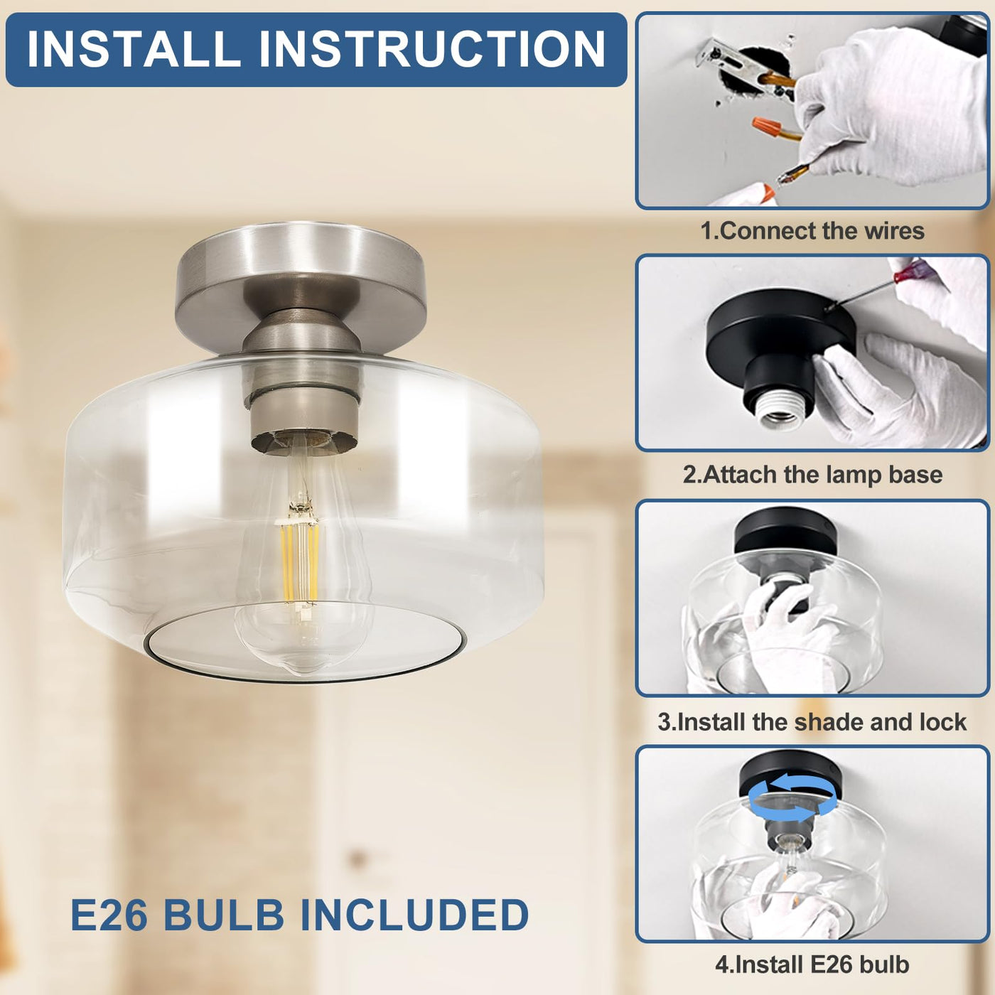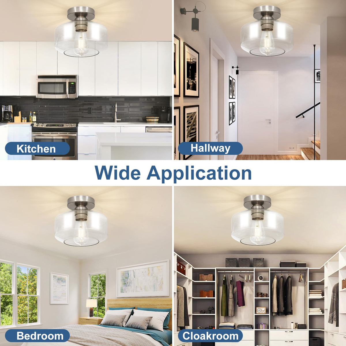 Industrial Semi Flush Mount Ceiling Light: Brush Nickel Kitchen Lighting Fixtures Ceiling With Clear Glass - Vintage Hallway Lig