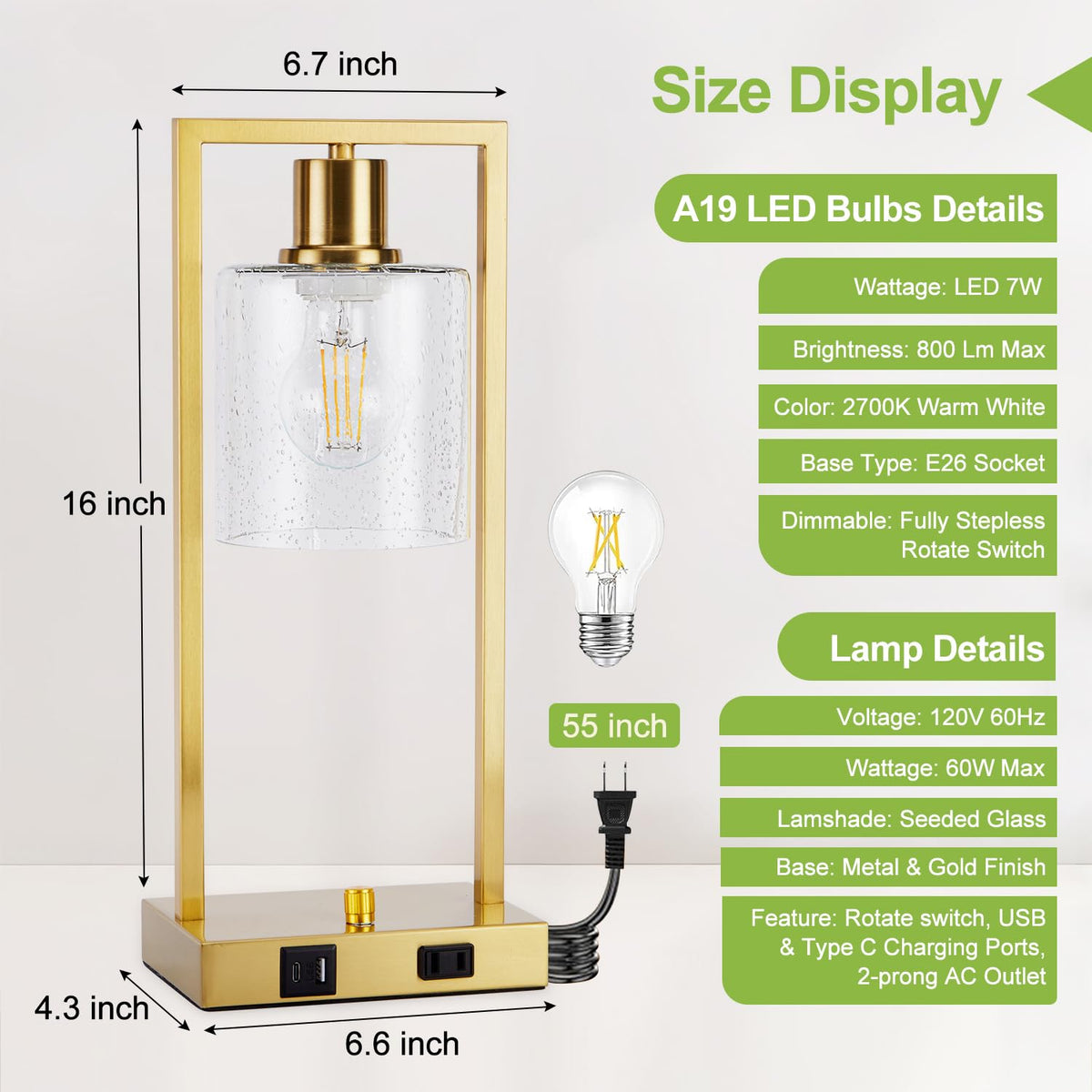 Q: What type of bulb is included with the lamps?A: The lamps include a dimmable A19 LED bulb rated at 7W with a warm white color temperature of 2700K, providing eye-friendly lighting that is ideal for reading or relaxing.