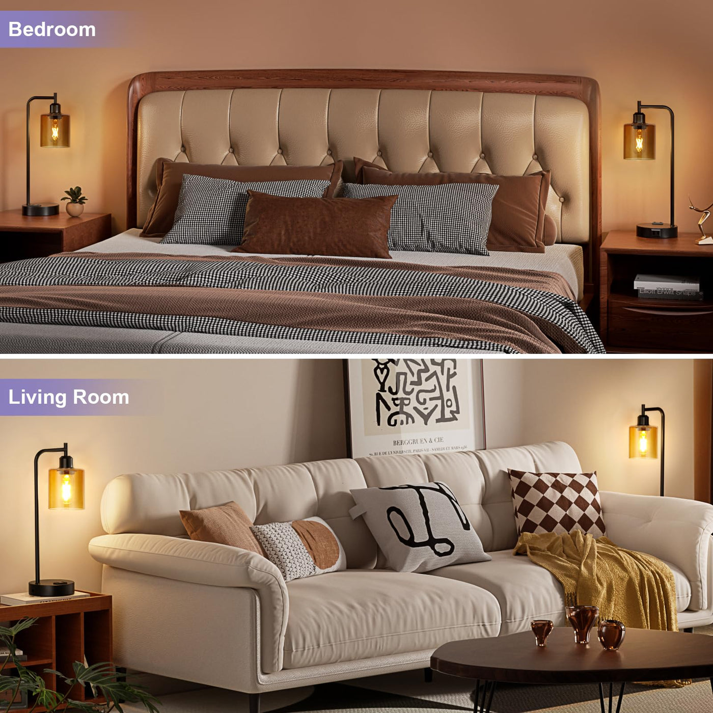 Industrial Touch Nightstand Lamps For Bedrooms Set Of 2 - 3-Way Dimmable Table Lamps With Usb C+A Ports And Outlet, Bedside Lamps With Amber Glass Shade For Living Room, Desk Lamps For Home Office