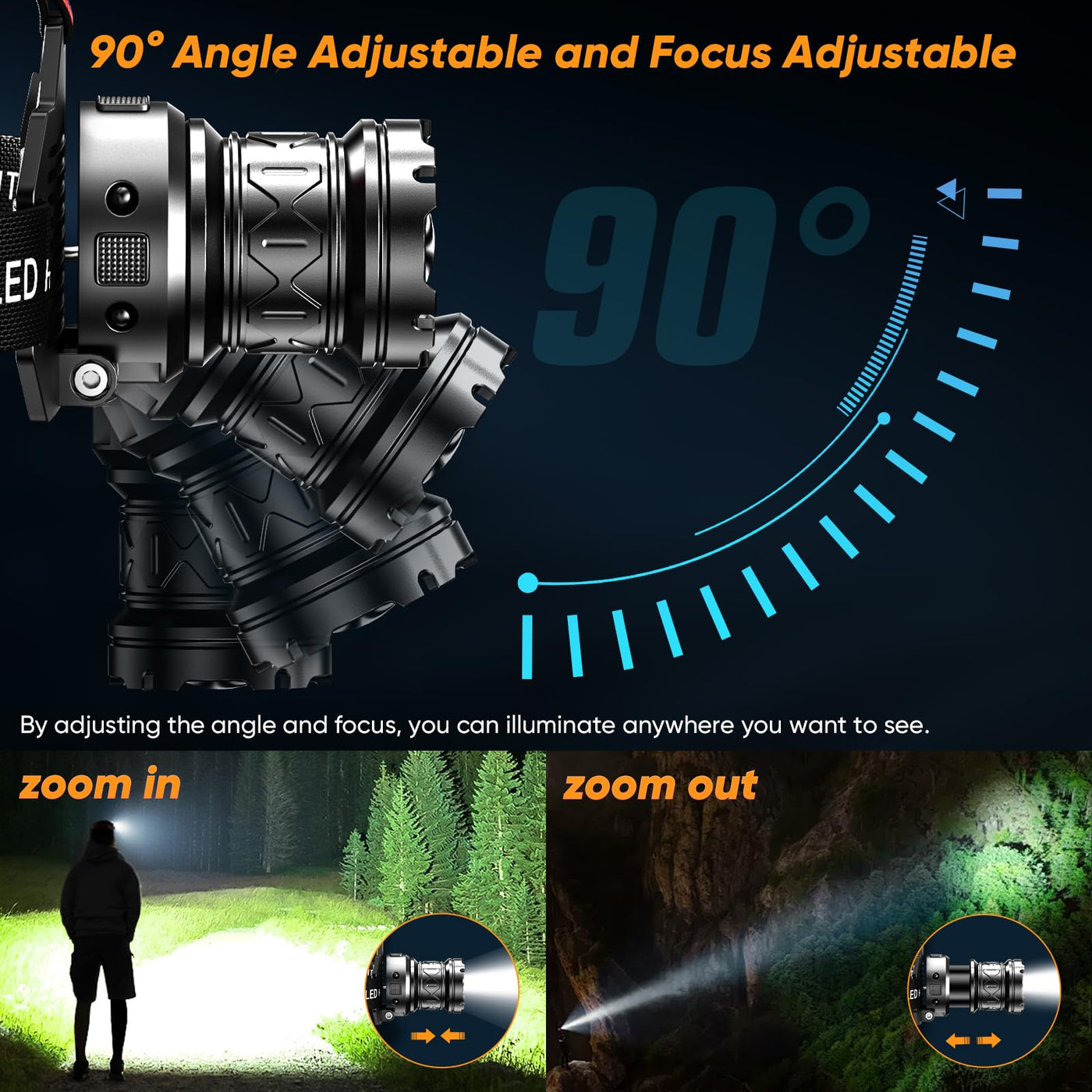 Q: Is the headlamp adjustable for different lighting needs?A: Yes, the INECOKS headlamp includes a zoomable lens that allows users to switch between a focused spotlight and a wide-area floodlight, along with a 90-degree adjustable lamp head for precise light direction.