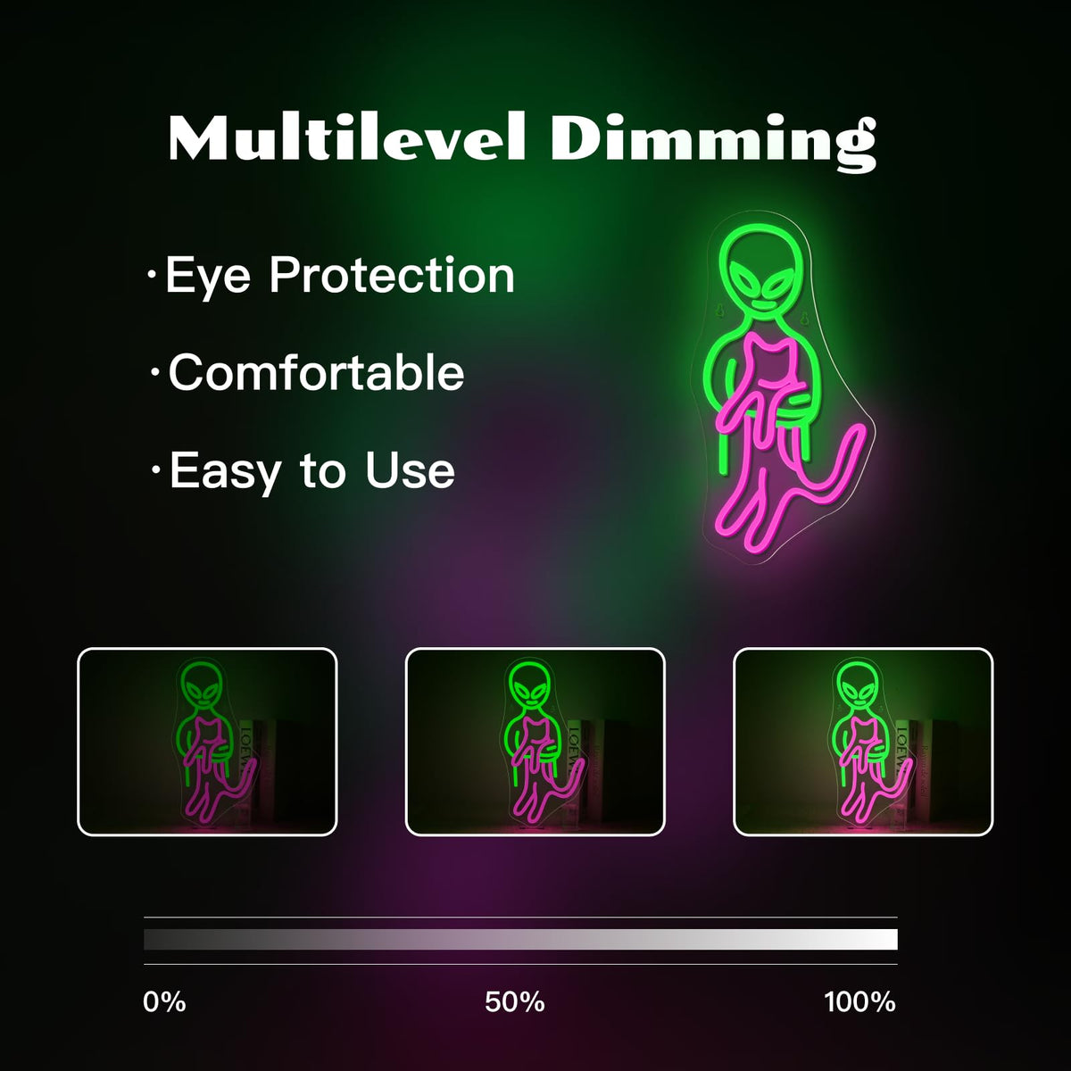 This neon sign features a charming design of an alien holding a cat, crafted from well-made materials. The sign is made using durable LED neon tubes that bend into an eye-catching shape, emitting a vibrant combination of green and pink light. The elegant design is complemented by enhanced craftsmanship, utilizing transparent acrylic and LED light strips to create a vivid, detailed appearance that brightens up any wall.