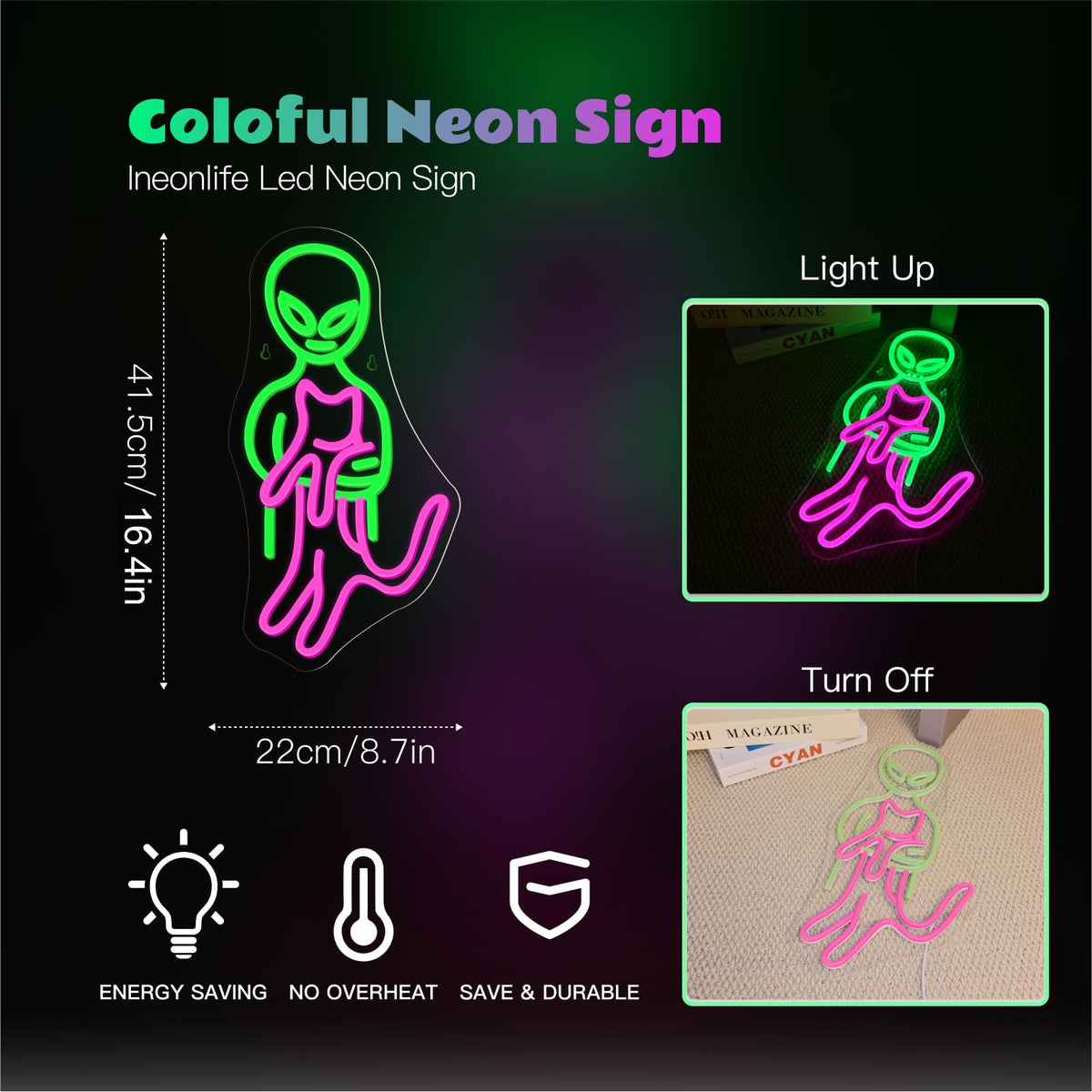 The ineonlife Alien Cat Neon Sign is perfect for anyone looking to add a fun, whimsical element to their home or office. Its vibrant colors and unique design make it a fantastic choice for decorating personal spaces, and it serves as an excellent gift for loved ones who appreciate creative decor. Transform your environment and create a lively atmosphere with this enchanting neon sign.