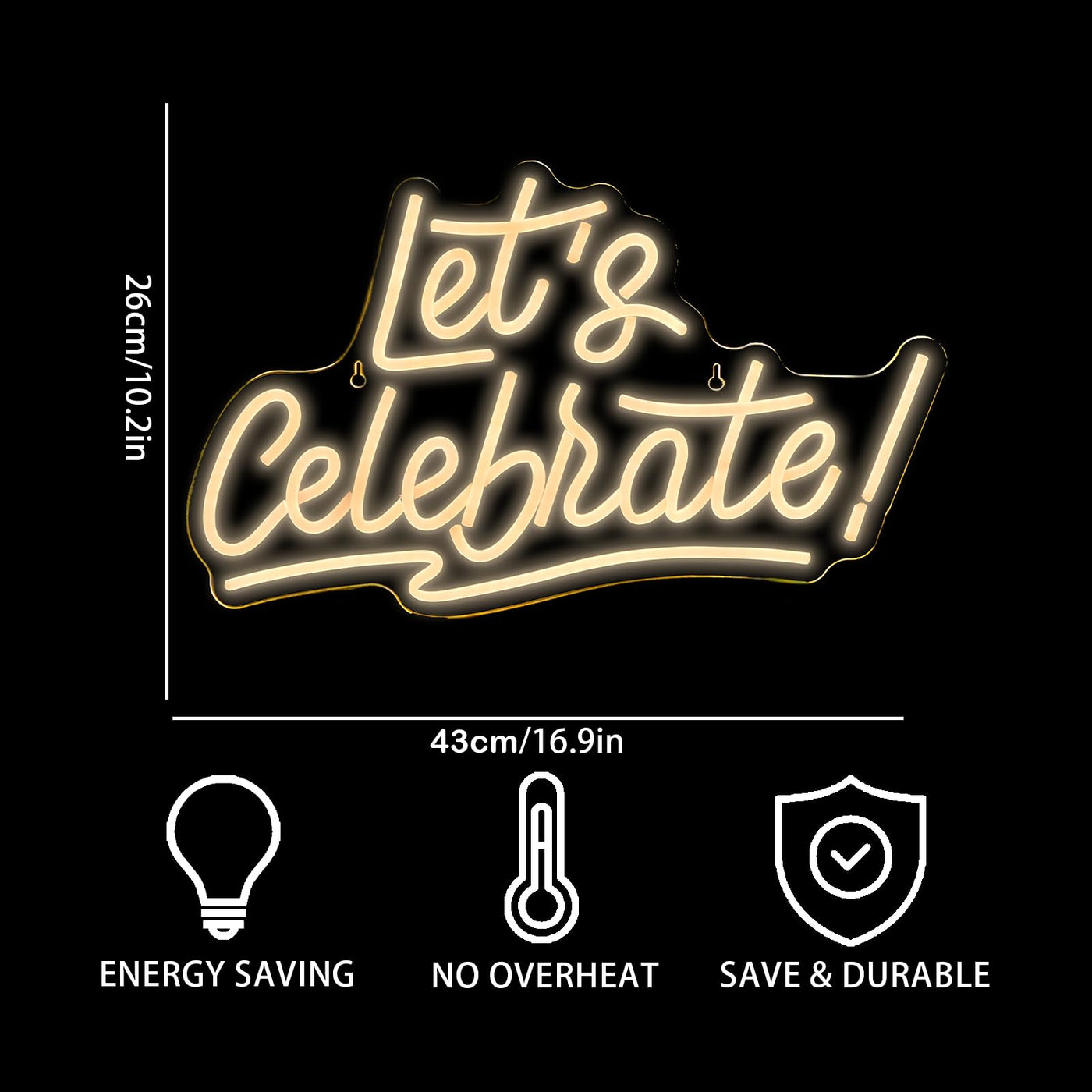 The Lets Celebrate Neon Sign features a unique design that emits bright, colorful light, creating a magical atmosphere. Measuring an impressive 16.9x10.2 inches, it is easily visible from anywhere in the room. Made with well-made materials, including a flexible LED strip and an acrylic back plate, this neon sign is built to last. It operates on a low voltage system, ensuring safety and durability while consuming minimal energy.