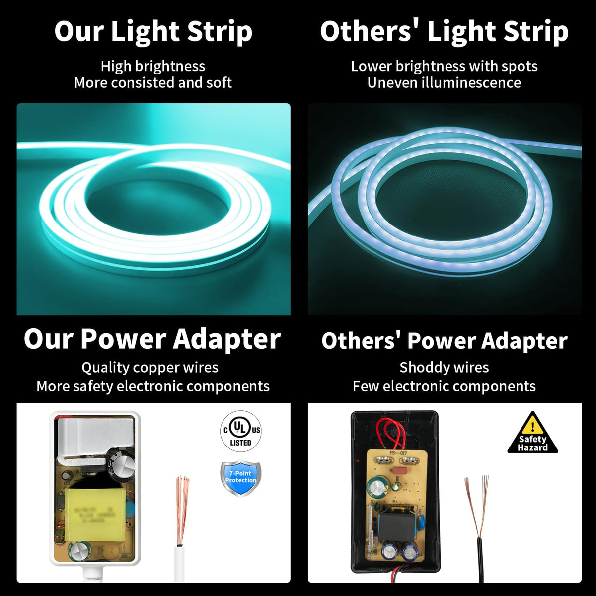 Q: Are the LED lights safe for indoor use?A: Yes, the low heat output of the twelve-volt LED strip lights makes them safe for indoor use, reducing the risk of burns or overheating.