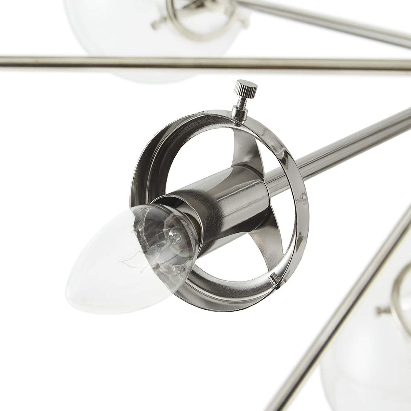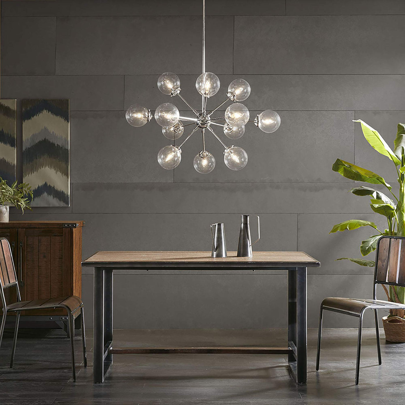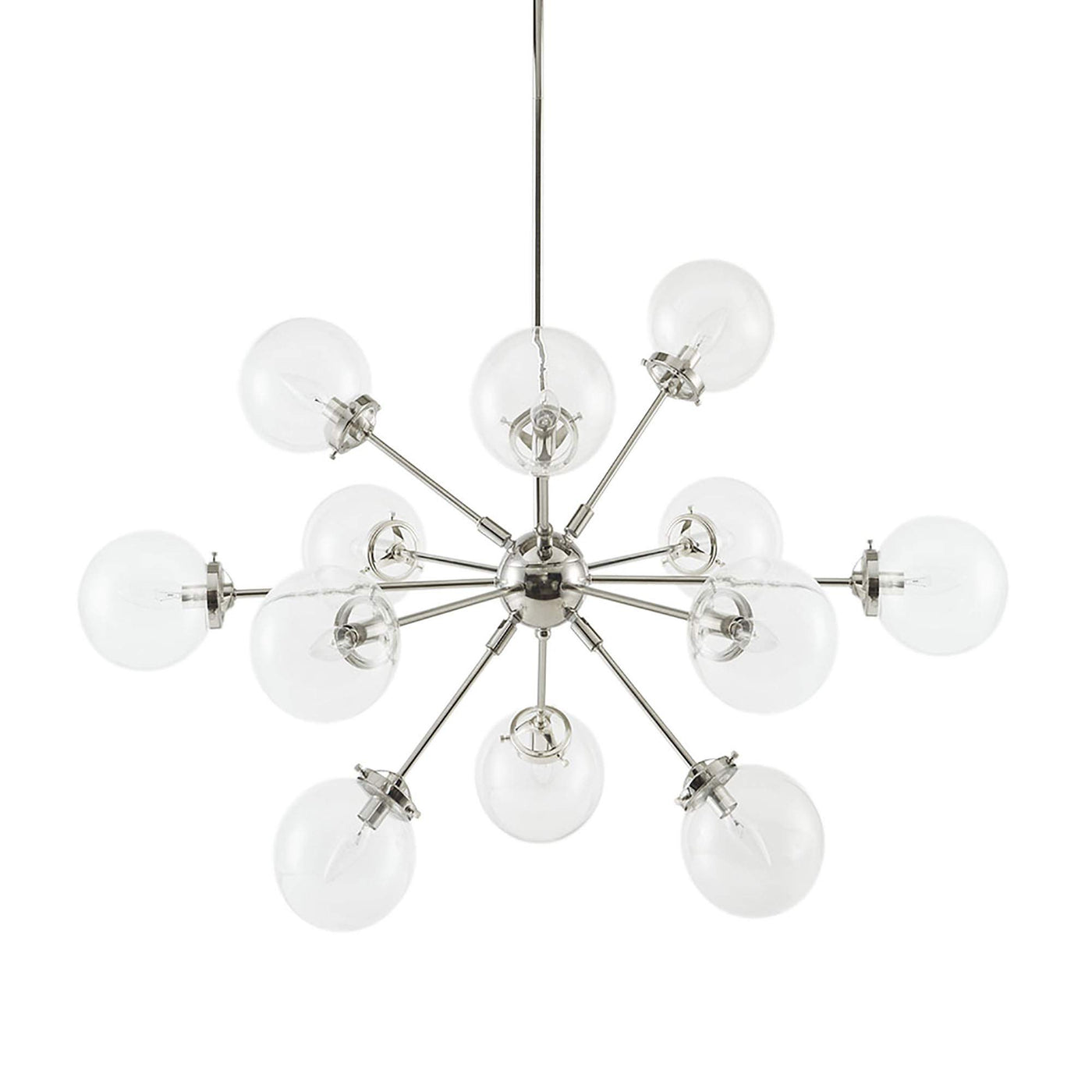 With its contemporary design, the Paige 12-Light Chandelier with Oversized Globe Bulbs adds intrigue to any space. Crafted from high-quality metal and glass, this chandelier features a unique aesthetic, showcasing twelve clear glass shades that elegantly diffuse light. The adjustable base ensures versatility in installation, while the sleek silver finish lends a modern touch, making it a perfect addition to living and dining rooms. Professional installation is recommended. Note that twelve Type-B light bulbs are necessary for operation, but bulbs are not included.
