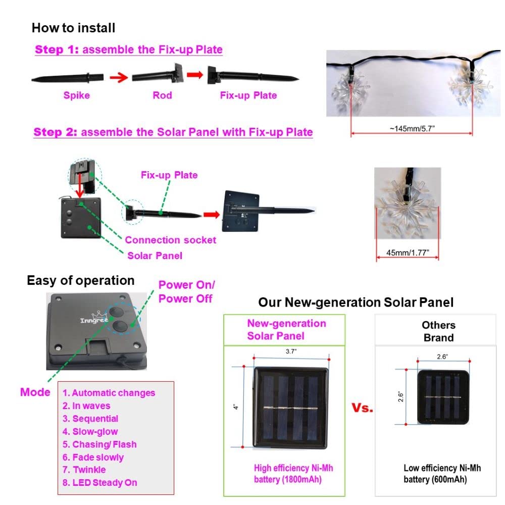 FEATURES? New Design. New generation solar panel with high energy conversion rate, the light will work for 8~12 hours at night ? High Environment Suitability. Be easily installed on hedge, trees, grassland, wall, stairs, etc.? Waterproof High Performance. Solar panel and 30 LED lamps tested as IP65SPECIFICATION? LED lamps quantities: 30 LEDs? Light length: 20 ft, 4.9 ft from solar panel to 1st LED lamp, 0.5 ft between two lamps ? Built-in storage battery: Ni-Mh battery, 1.2V1800mAh ? Solar panel: 2V 300mA ? Charging time: 8~12 hours basing on the strength of illumination? Working time: 8~10 hours after full charged PACKAGE1. Solar light 1pcs 2. Solar panels ground stake 1pcs3. User manual 1pcs NOTE1. Solar Panel be fully charged >10 hours in 1st time, the panel only be charged under On mode (On button at the back of solar panel)2. Installation with the stake: if the ground is too hard, dont twist the panels ground stake with force, try to loosen the ground with water firstly then use a hammer to hit the stake into the ground gently3. Automatically working. Turn the light on and set light mode before charging so it will light up at dusk, it will be lighting in the evening or insufficient light in daytime, may turn off automatically when ambient light is too strong (>15 lux) by using unique optical control technology4. Easy to use. Only two switches: Power (On/ Off) and Mode (Flashing/ No-flash). 5.FAQA. Light not worksB. Light dim C. Light no works in raining/ snowing seasonsThe root cause is: I. The light Not charged at all, ONLY using the lights battery until it was used up, need to charged under the sunII. If the weather all days is raining or snowing, no sun light at all or the light is weak, so the light not being charged enough, the light may be dim, yet it will be recovered if full of sunshine.