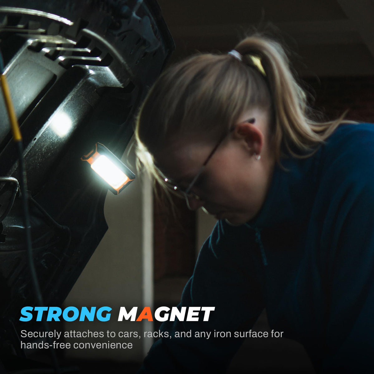 ?GOOD BRIGHTNESS & 3 LINGHTING MODES?40W 1500lumens COB LED. This work light has 3 modes to meet your different needs: high brightness, low brightness and strobe. It is easy to operated, just press the button to switch brightness levels. The maximum lighting distance is 85ft in high brightness mode. The continuous running time around 8 hours under low mode and strobe Mode for emergency. | ?RECHARGEABLE & CHARGE FOR YOUR SMART PHONE?Rechargeable built-in long life batteries (included), equipped with a rechargeable charging port for quick and convenient charging. It glows red at the bottom when charging, and green when fully charged. This portable work light can charge your smart phone and other mobile devices in emergency. | ?LONG-LASTING?This rechargeable work light is especially suitable for outdoor camping, hiking, working, car repair, etc. by using industrial class plastic and long-lasting aluminum alloy material, our light can pass 5ft drop test | ?HOOK & STRONG MAGNETIC BASE?Our rechargeable work light comes with Built-in strong magnet, which make it can be firm stay on car, track or any other metal surface. The hook design allows the work lamp to be hang on objects such as tents use as camping light. | ?PORTABLE & LIGHT WEIGHT?This work light is designed for multi-purpose, prefect for indoor and outdoor activities, It give you wild applications for home, car repair, camping, Working on repair, emergency roadside repairs ext.