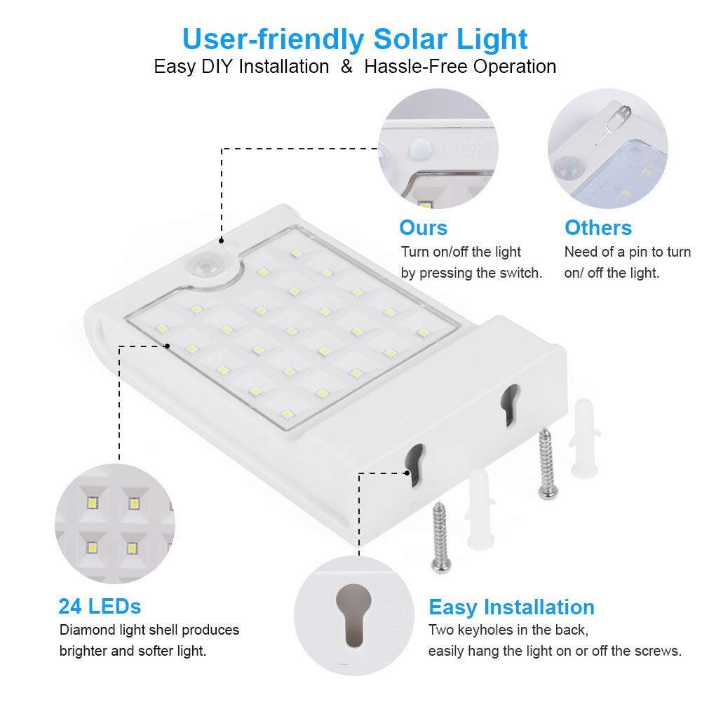 - **Ultra-Bright Illumination**: Boasting 24 powerful LED lights, these solar lights deliver an impressive 150 lumens of brightness, perfect for enhancing security and visibility around your property.