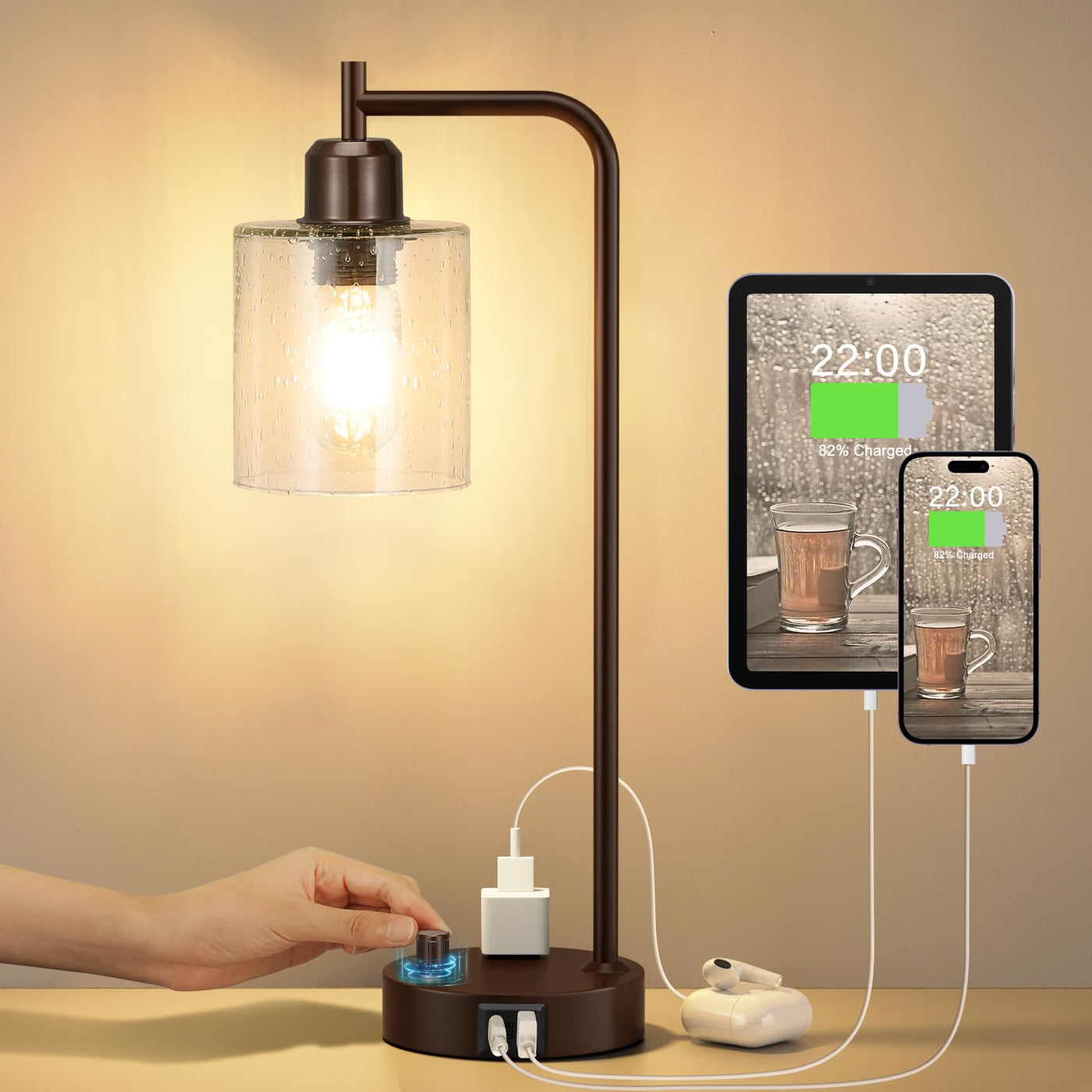 Brown Industrial Bedside Table Lamp for Bedroom - Nightstand Lamps with USB C Charging Port, Fully Dimmable Black Ports and Outlets, Small Desk Glass Shade Office Living Room
