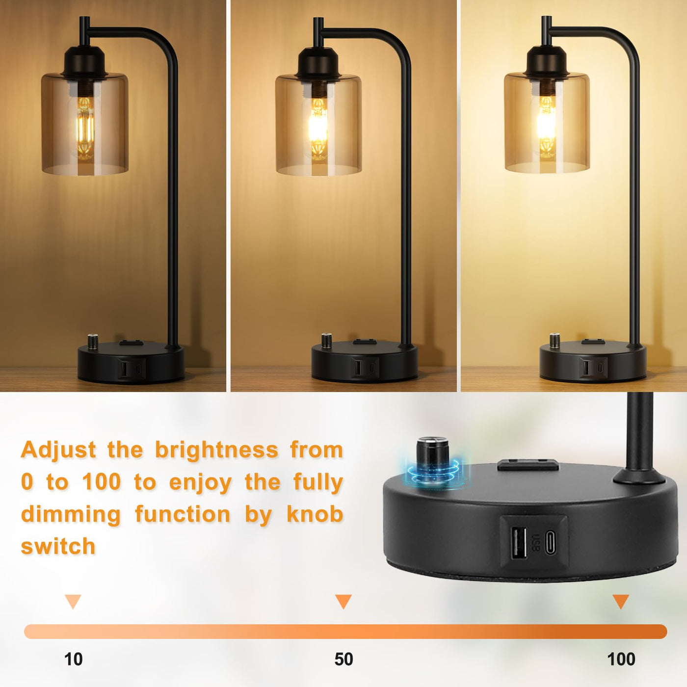 Innqoo Industrial Bedside Lamps Set of 2 - Dimmable with USB Ports, Amber Glass Shade, Black, Model 2-4