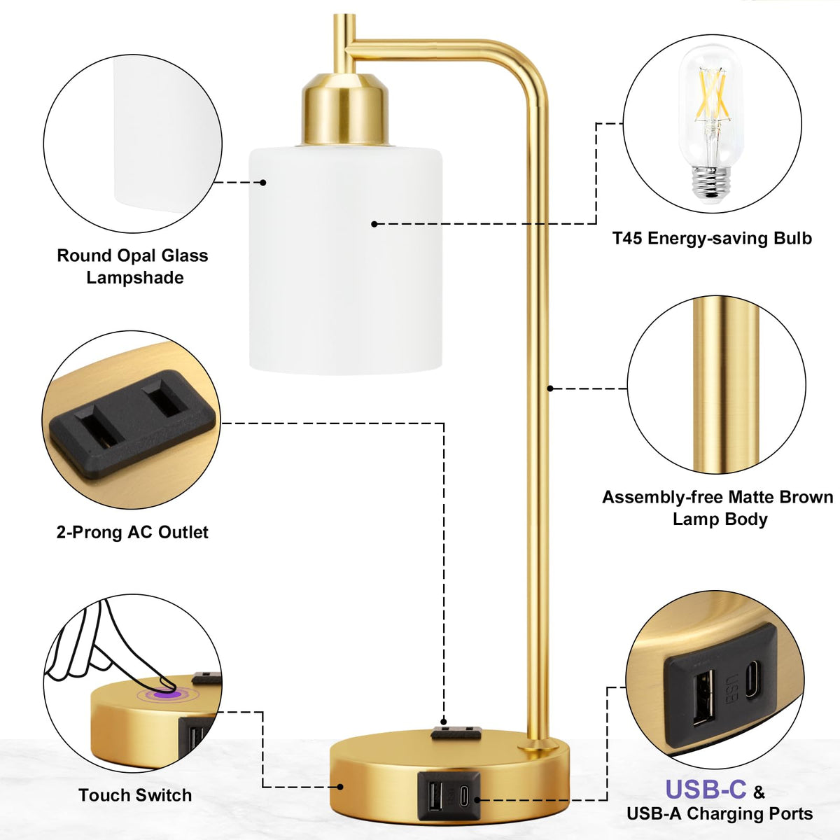 Innqoo Industrial Gold Table Lamps For Bedrooms Set Of 2-3-Way Dimmable Desk Lamp With Usb C+A Ports And Outlet, Gold Lamps With Opal Glass Shade For Living Room, Desk Lamps For Home Office
