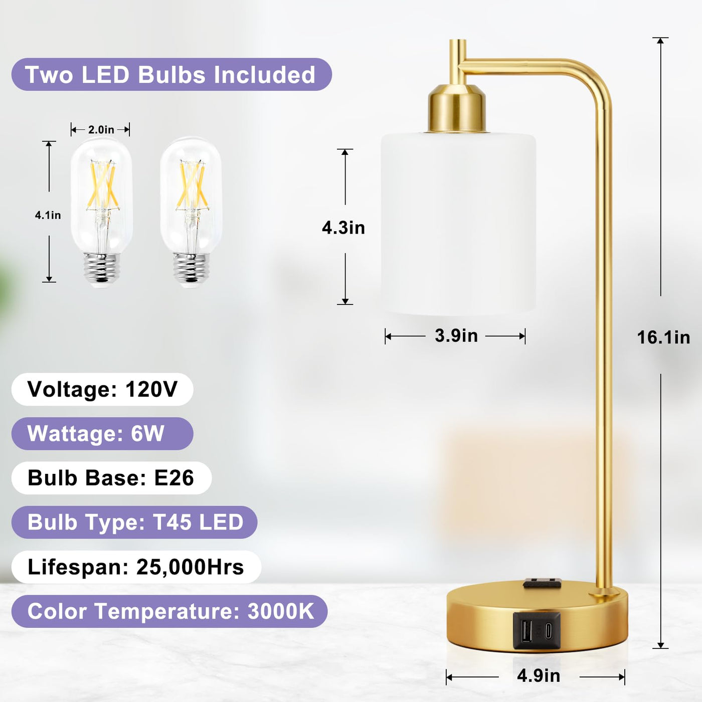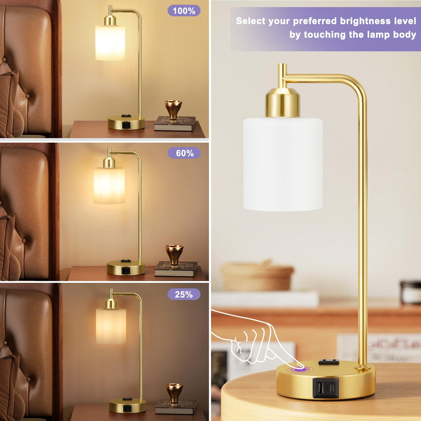 Industrial Gold Table Lamps for Bedrooms Set of 2-3-Way Dimmable Desk Lamp with USB C+A Ports and Outlet, Gold Lamps with Opal Glass Shade for Living Room, Desk Lamps for Home Office