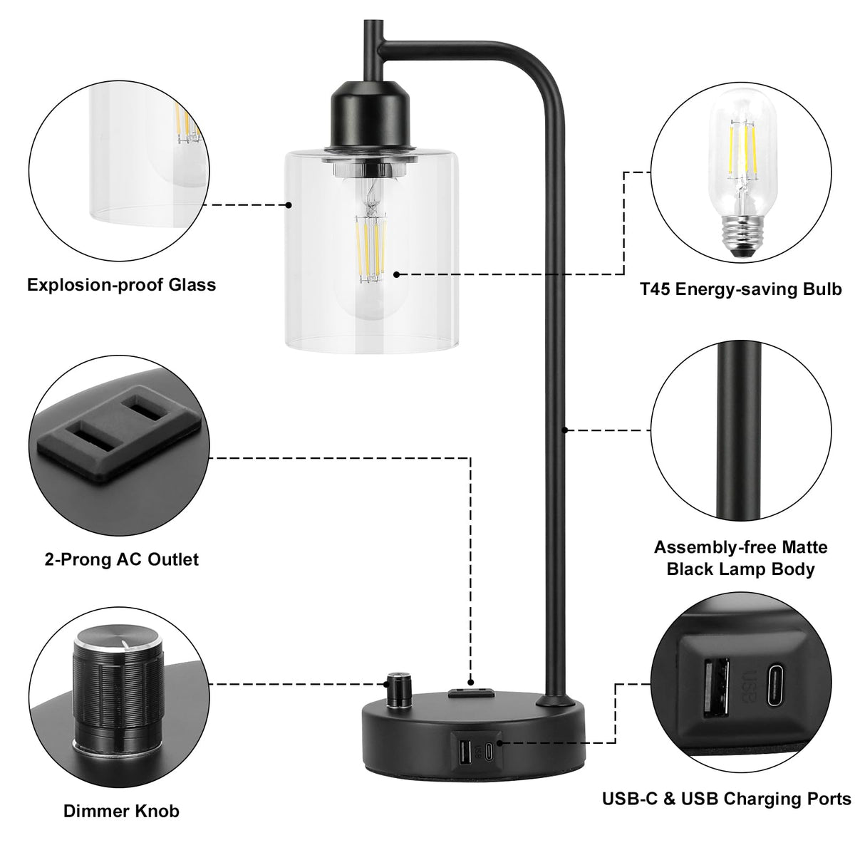 Innqoo Industrial Nightstand Lamps Set of 2 - Fully Dimmable, Black Glass Shade, USB A/C Ports, Model 2-5