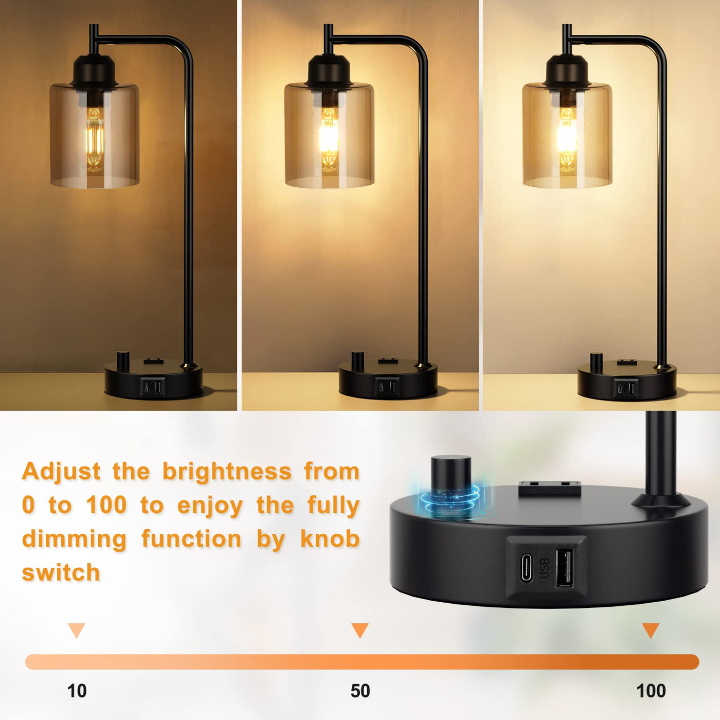 Innqoo Industrial Small Desk Lamp For Nightstand - Amber Clear Glass Shade Table Lamp With Usb C Port, Fully Dimmable Black Bedside Lamp With Usb Port And Outlet, Bedroom Lamp For Reading Office