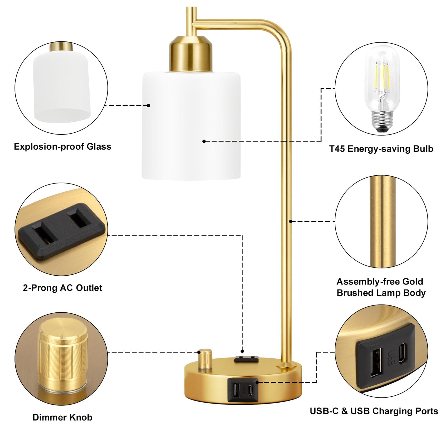 Industrial Table Lamps For Bedroom Set Of 2 - Fully Dimmable Bedside Lamps With Usb Ports And Outlet, Gold Nightstand Lamps With Opal Glass Shade For Living Room, Desk Lamps For Office Reading