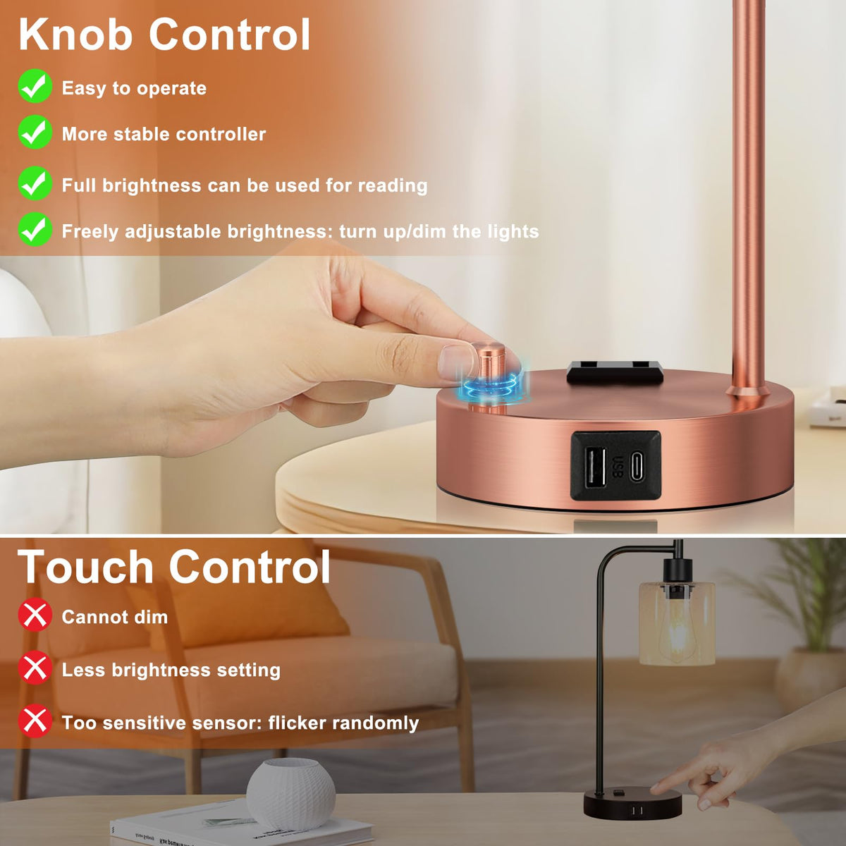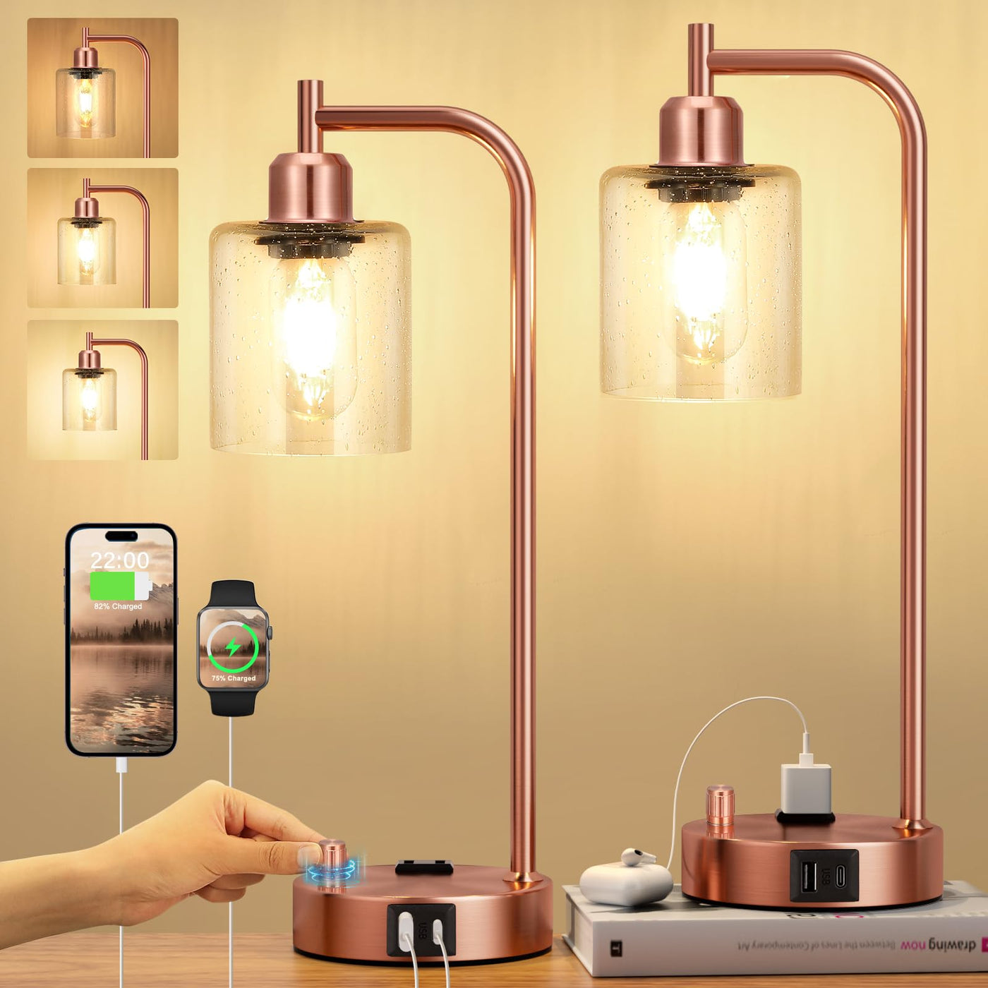 Industrial Table Lamps for Bedrooms Set of 2 - Fully Dimmable Bedside Lamps with USB Ports and Outlet, Rose Gold Nightstand Lamps with Glass Shade for Living Room, Desk Lamps for Office Reading