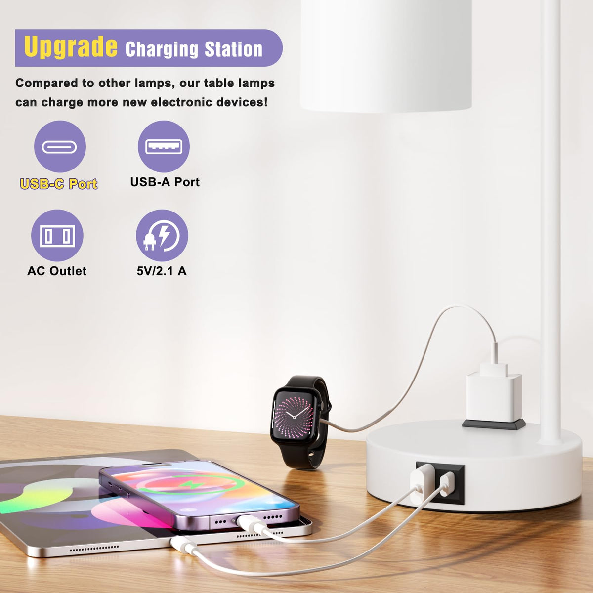 Integrated dual USB C+A charging ports (5V/2.1A) and an AC outlet for powering multiple devices.