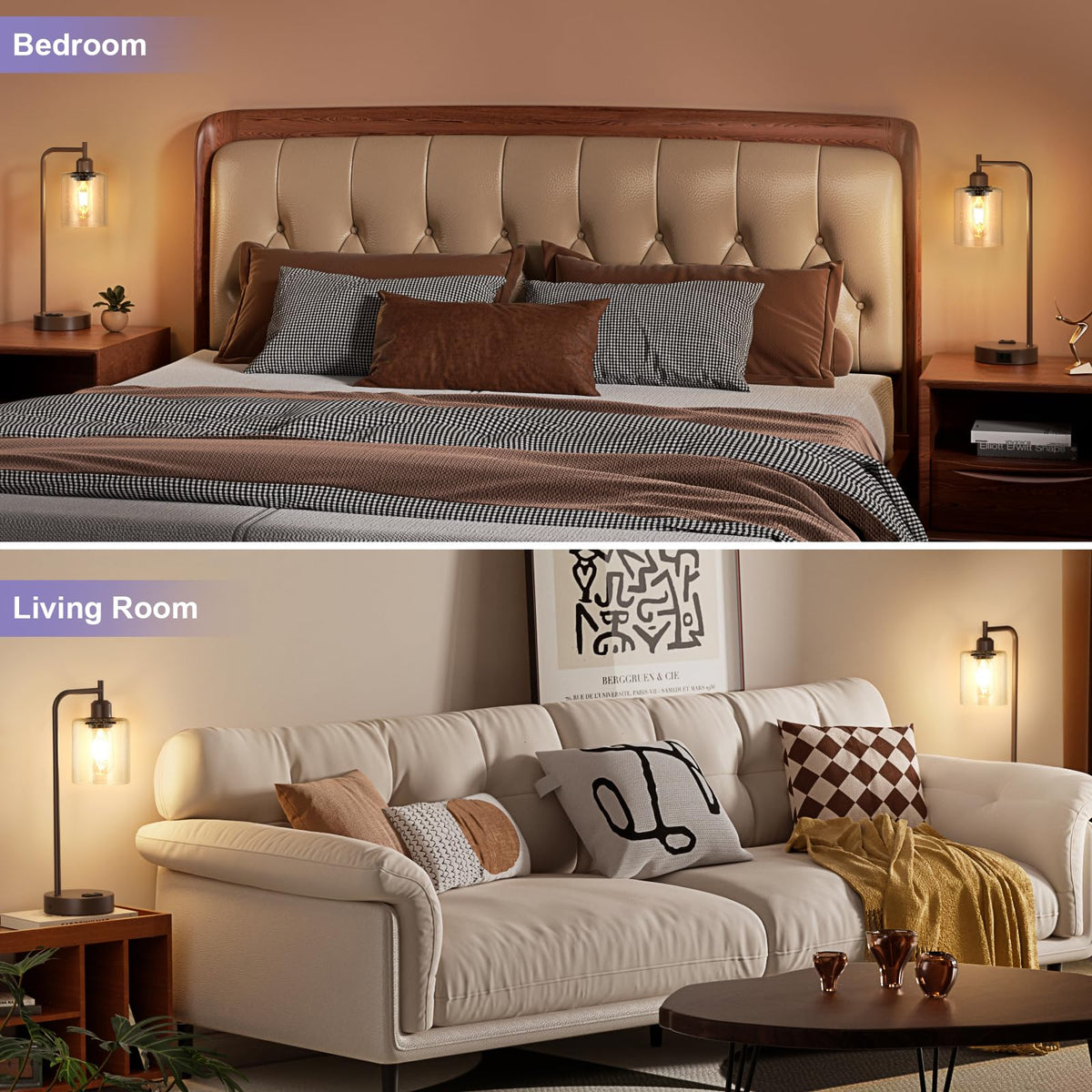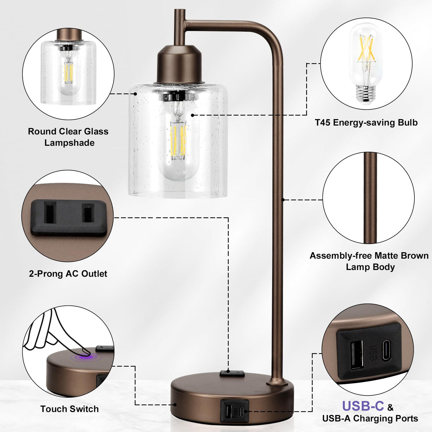 Industrial Touch Table Lamps for Bedrooms Set of 2 - 3-Way Dimmable Lamps with USB C+A Ports and Outlet, Brown Bedside Lamps with Seeded Clear Glass Shade for Living Room, Desk Lamps for Home Office