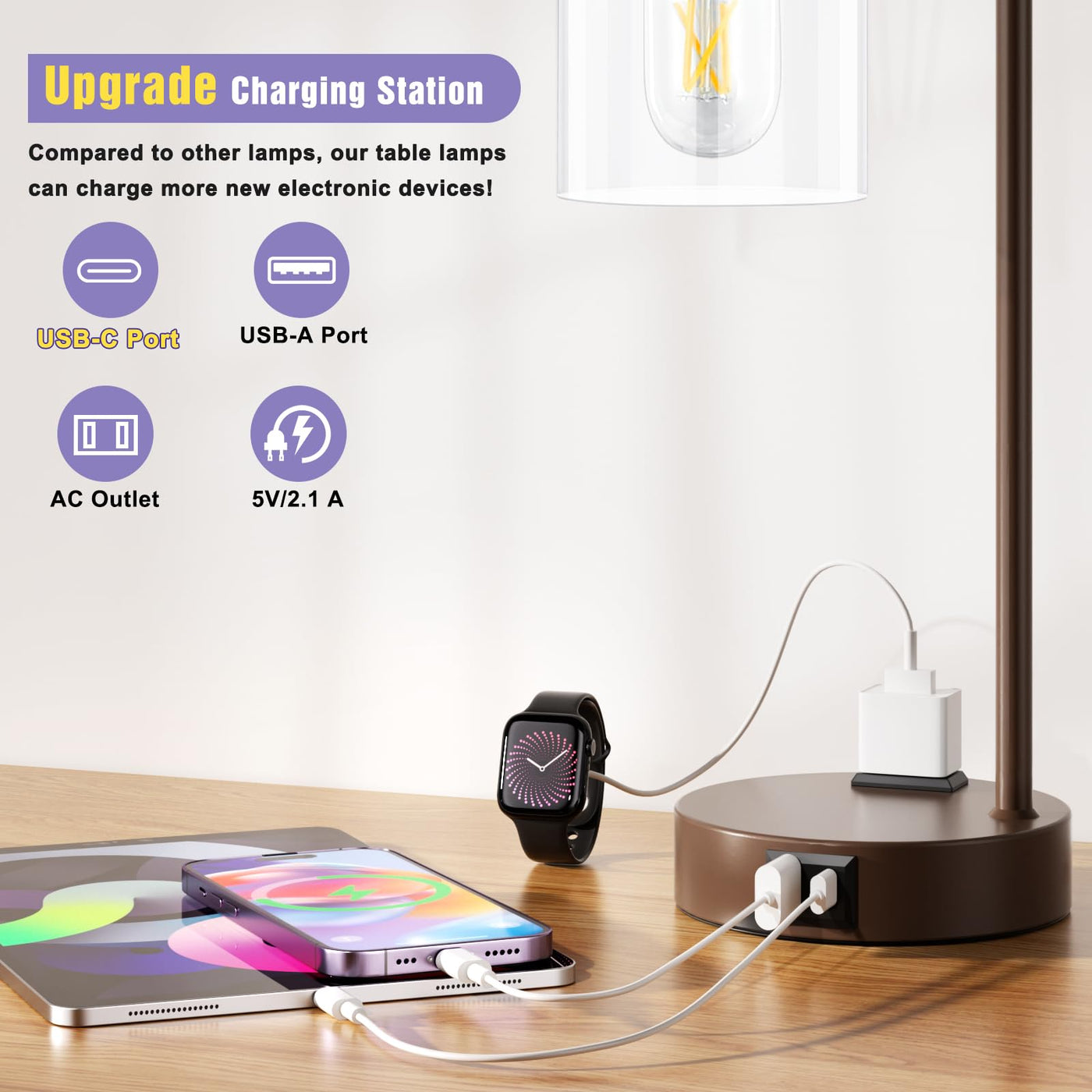Innqoo Industrial Touch Table Lamps For Bedrooms Set Of 2-3-Way Dimmable Lamps With Usb C+A Ports And Outlet, Brown Bedside Lamps With Clear Glass Shade For Living Room, Desk Lamps For Home Office