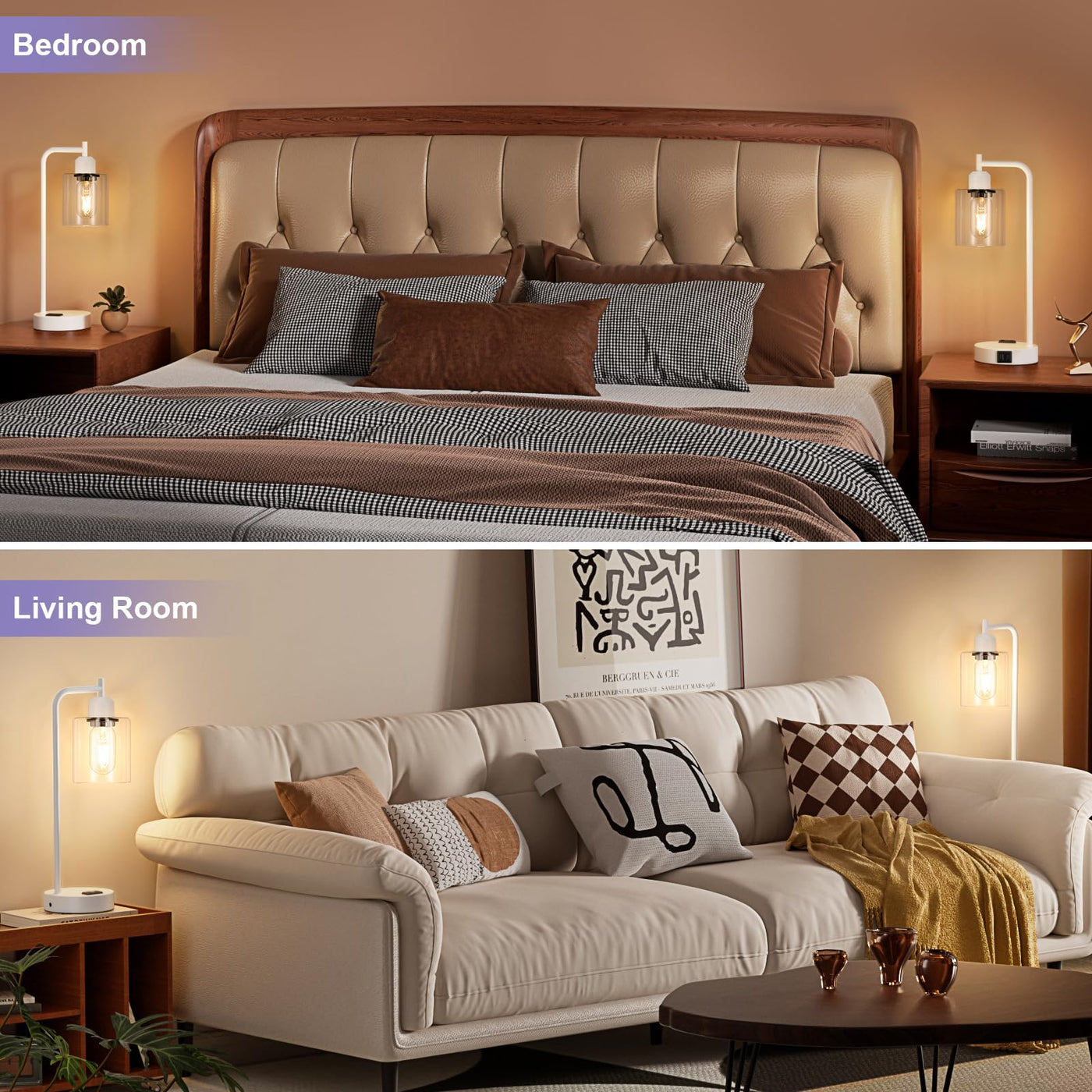 Industrial White Table Lamps for Bedrooms Set of 2 - 3-Way Dimmable Desk Lamp with USB C+A Ports and Outlet, White Lamps with Clear Glass Shade for Living Room