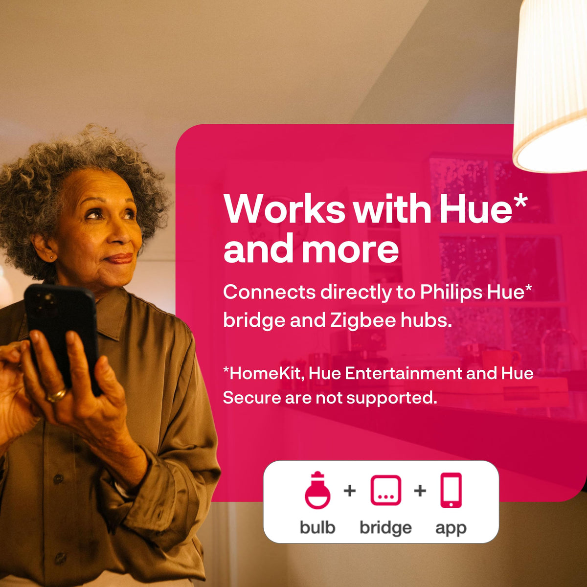 Elevate the normal lighting experience with innr's E26 Smart Bulbs, boasting an impressive 1150 lumens for optimal brightness. Adjustable light bulb These Zigbee light bulbs are dimmable, allowing you to tailor your lighting to the moment. Whether you seek energetic brightness during the day or a softer white glow for relaxation, these smart LEDs effortlessly adapt to your needs. Highly compatible smart A19 LEDs Compatible with various smart home systems, these dimming light bulbs can be controlled remotely through your smartphone or voice commands. These bulbs work with Philips Hue* and more. Innr products connect directly to Zigbee compatible hubs, including Philips Hue*, SmartThings and Alexa devices with built-in smart hub. *Does not work with Apple Homekit, Hue Entertainment, Hue Secure. Durable smart lighting Enjoy a long-lasting lighting solution that not only brightens your space but also adds a touch of smart sophistication to your home. Automation and energy saving By utilizing advanced automation features, these 1150 Lumen smart bulbs enable you to schedule lighting routines and create personalized scenes. Additionally, their energy-efficient design helps reduce electricity consumption, resulting in long-term cost savings and environmental benefits.