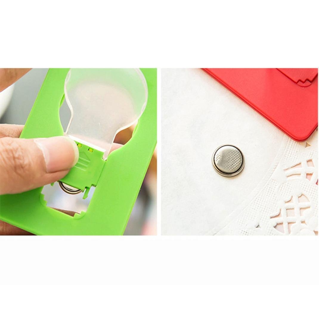 Product Specifications: Item: Brand New Card Light (Card Light Is Designed As Cute Mini Night Decoration Light. Please Use It At Night Will Have Enough Bright Lighting) Light Source: Led Bulbs Power Source: Dry Battery(Button Cell Including!) Dimension: 86*54*3Mm (Credit Card Size) Weight: 15G, Light Color : White, Card Color: Green Wireless Led Light (Open Up For On/Close Up For Off) Credit Card Size, Can Be Placed In Wallets It Is Wonderful For Your Bedroom, Baby Room, Bathroom, Corridor And Other Rooms Carry On Anytime & To Anywhere You Go; Light Up Anytime & Anywhere You Want The Interior Has A Led Light Bulb, When You Need To Illuminate, You Just Fold Light Bulb Up Then The Light Turns On. If Put Light Bulb Down, Then The Light Turns Off. You Can Use It Anytime And Anywhere. Package Include : 10 Pcs Green Card With White Color Light & 5 Pcs Cr1220 Battery
