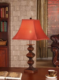 What truly defines the fascinating and distinctive look in this table lamp is the copper color stack design poly resin base and a matching red fabric shade. Features a 3 way switch, uses up to standard 100 watt bulb. Item Height: 27. Item Width: 6.5. Item Depth: 14