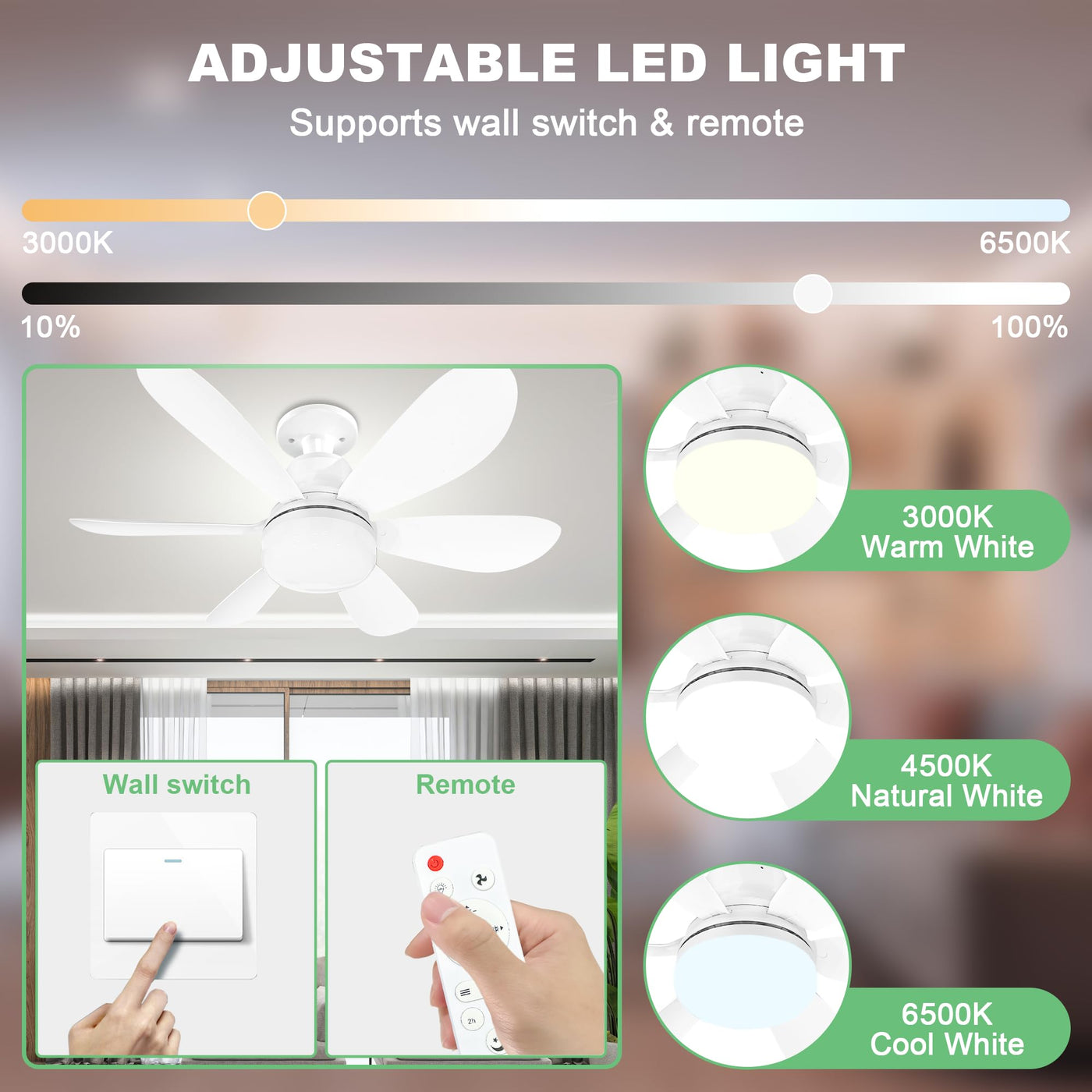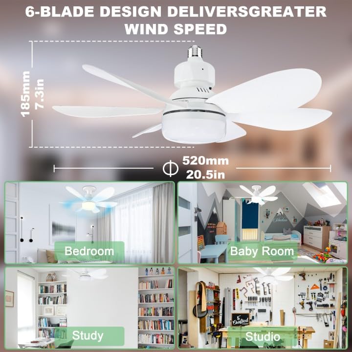Product Information Product Name:INSCROK Socket Fan Light Model:Q6 Product Color:Wihte Light Color:Cool/Cool Warm/Warm Number of Blades:6 Size:20.5Inch Weight:500G Detailed parameters Input Voltage:85-265V-50/60HZ Wattage:40W CCT:3000K-6500K Wind Speed:3 Speeds Memory Function: YES Imining Function:YES Sudden-stop Protection:YES Control Mode:Remote Control/Wall Switch